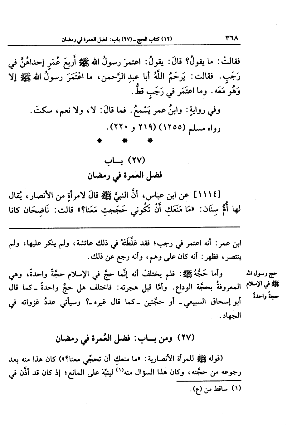 [1114] عَن ابنِ عَبَّاسٍ أَنَّ النَّبِيَّ -صَلَّى اللَّهُ عَلَيهِ وَسَلَّمَ- قَالَ لِامرَأَةٍ مِن الأَنصَارِ يُقَالُ لَهَا أُمُّ سِنَانٍ: مَا مَنَعَكِ أَن تَكُونِي حَجَجتِ مَعَنَا؟ قَالَت: نَاضِحَانِ كَانَا