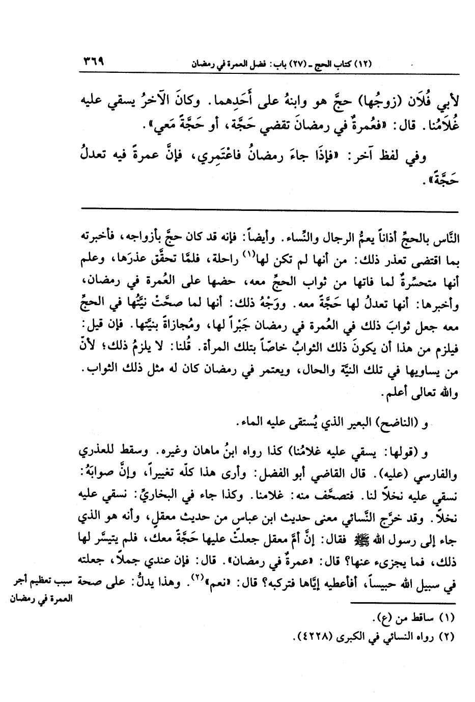 قال القاضي أبو الفضل: وأرى هذا كلّه تغييرًا، وإن صوابه: (نسقي عليه نخلاً لنا). فتصحَّف منه: (غلامنا). وكذا جاء في البخاري: (نسقي عليه نخلاً). وقد خرَّج النسائي معنى حديث ابن عباس من حديث معقل، وأنه هو الذي جاء إلى رسول الله - صلى الله عليه وسلم - فقال: إن أم معقل جعلت عليها حجَّة معك، فلم يتيسَّر لها ذلك، فما يجزئ عنها؟ قال: (عمرة في رمضان). قال: فإن عندي جملاً، جعلته في سبيل الله حبيسًا، فأعطيه إيَّاها فتركبه؟ قال: (نعم) (¬2). وهذا يدلُّ على صحة