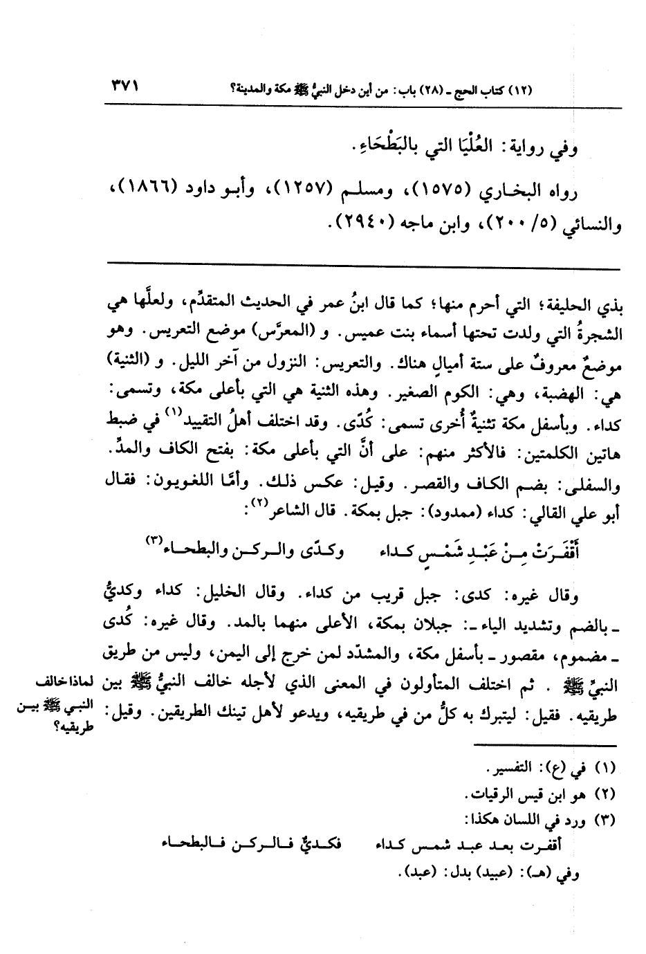 وقال غيره: كدى: جبل قريب من كداء. وقال الخليل: كداء وكدَي - بالضم وتشديد الياء -: جبلان بمكة، الأعلى منهما بالمد. وقال غيره: كدى - مضموم، مقصور -: بأسفل مكة، والمشدَّد لمن خرج إلى اليمن، وليس من طريق النبي - صلى الله عليه وسلم -. ثم اختلف المتأولون في المعنى الذي لأجله خالف النبي - صلى الله عليه وسلم - بين طريقيه. فقيل: ليتبرك به كل من في طريقيه، ويدعو لأهل تينك الطريقين. وقيل: