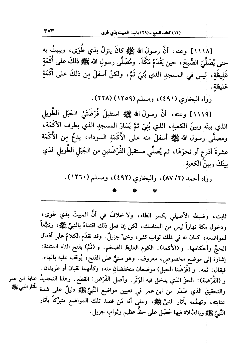 [1118] وعنه، أَنَّ رَسُولَ اللَّهِ -صَلَّى اللَّهُ عَلَيهِ وَسَلَّمَ- كَانَ يَنزِلُ بِذِي طَوًى، وَيَبِيتُ بِهِ حَتَّى يُصَلِّيَ الصُّبحَ، حِينَ يَقدَمُ مَكَّةَ، وَمُصَلَّى رَسُولِ اللَّهِ -صَلَّى اللَّهُ عَلَيهِ وَسَلَّمَ- ذَلِكَ عَلَى أَكَمَةٍ غَلِيظَةٍ، لَيسَ فِي المَسجِدِ الَّذِي بُنِيَ ثَمَّ، وَلَكِن أَسفَلَ مِن ذَلِكَ عَلَى أَكَمَةٍ غَلِيظَةٍ.