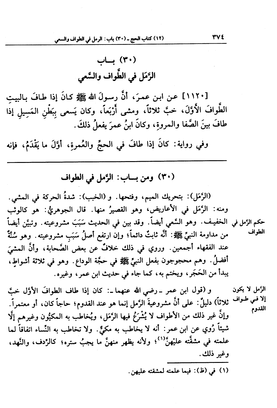 [1120] عَن ابنِ عُمَرَ أَنَّ رَسُولَ اللَّهِ -صَلَّى اللَّهُ عَلَيهِ وَسَلَّمَ- كَانَ إِذَا طَافَ بِالبَيتِ الطَّوَافَ الأَوَّلَ، خَبَّ ثَلَاثًا، وَمَشَى أَربَعًا، وَكَانَ يَسعَى بِبَطنِ المَسِيلِ إِذَا طَافَ بَينَ الصَّفَا وَالمَروَةِ، وَكَانَ ابنُ عُمَرَ يَفعَلُ ذَلِكَ.