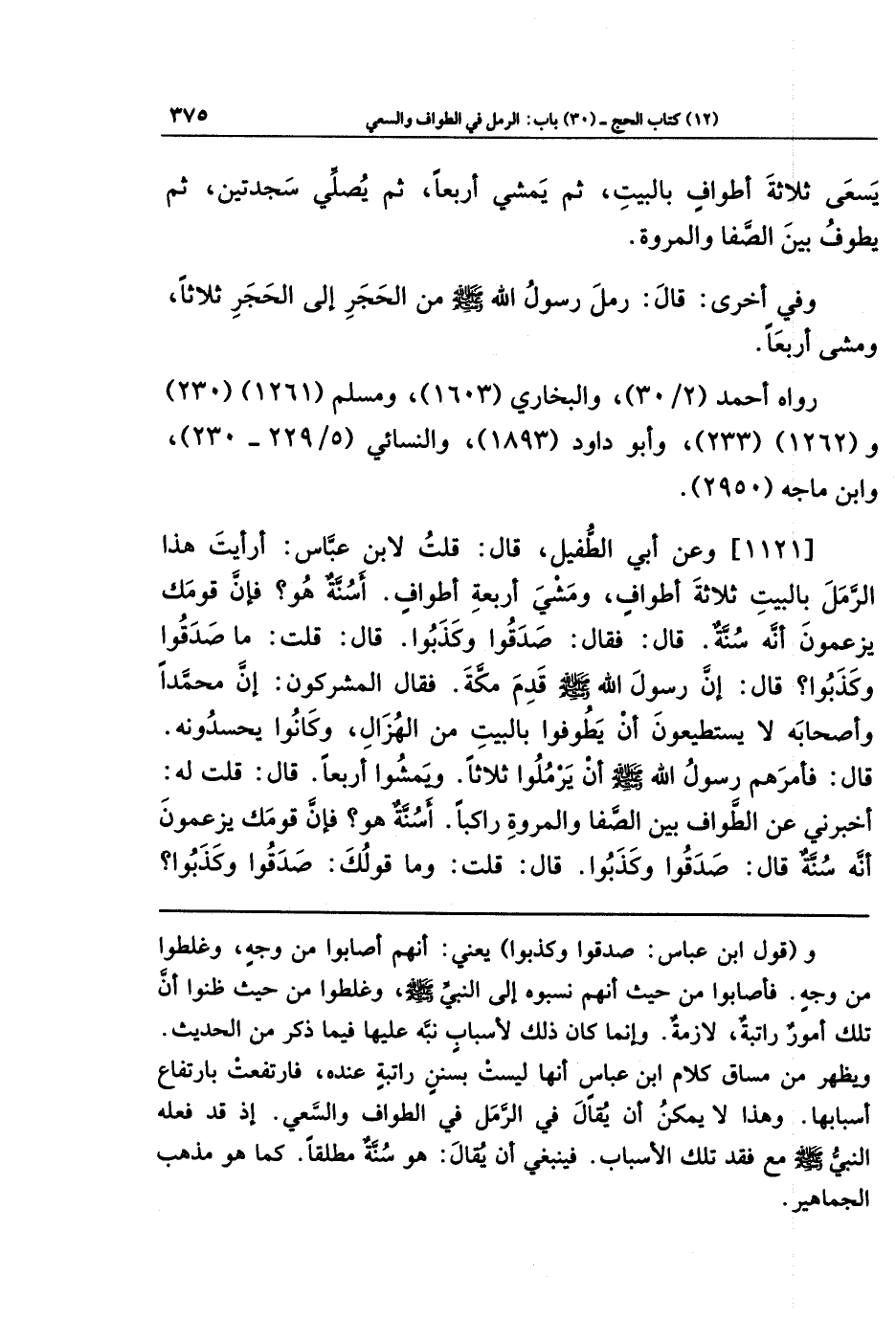 [1121] وعَن أَبِي الطُّفَيلِ، قَالَ: قُلتُ لِابنِ عَبَّاسٍ: أَرَأَيتَ هَذَا الرَّمَلَ بِالبَيتِ ثَلَاثَةَ أَطوَافٍ، وَمَشيَ أَربَعَةِ أَطوَافٍ. أَسُنَّةٌ هُوَ؟ فَإِنَّ قَومَكَ يَزعُمُونَ أَنَّهُ سُنَّةٌ. قَالَ: فَقَالَ: صَدَقُوا وَكَذَبُوا. قَالَ: قُلتُ: مَا صَدَقُوا وَكَذَبُوا؟ قَالَ: إِنَّ رَسُولَ اللَّهِ -صَلَّى اللَّهُ عَلَيهِ وَسَلَّمَ- قَدِمَ مَكَّةَ. فَقَالَ المُشرِكُونَ: إِنَّ مُحَمَّدًا وَأَصحَابَهُ لَا يَستَطِيعُونَ أَن يَطُوفُوا بِالبَيتِ مِن الهُزَالِ، وَكَانُوا يَحسُدُونَهُ، قَالَ: فَأَمَرَهُم رَسُولُ اللَّهِ -صَلَّى اللَّهُ عَلَيهِ وَسَلَّمَ- أَن يَرمُلُوا ثَلَاثًا، وَيَمشُوا أَربَعًا. قَالَ: قُلتُ لَهُ: أَخبِرنِي عَن الطَّوَافِ بَينَ الصَّفَا وَالمَروَةِ رَاكِبًا. أَسُنَّةٌ هُوَ؟ فَإِنَّ قَومَكَ يَزعُمُونَ أَنَّهُ سُنَّةٌ، قَالَ: صَدَقُوا وَكَذَبُوا. قَالَ: قُلتُ: وَمَا قَولُكَ: صَدَقُوا وَكَذَبُوا؟