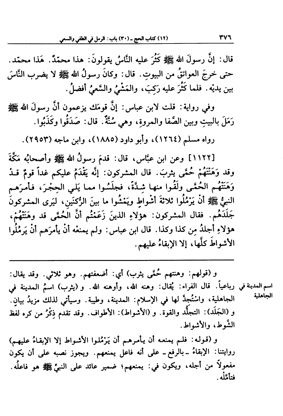 [1122] وعَن ابنِ عَبَّاسٍ، قَالَ: قَدِمَ رَسُولُ اللَّهِ -صَلَّى اللَّهُ عَلَيهِ وَسَلَّمَ- وَأَصحَابُهُ مَكَّةَ، وَقَد وَهَنَتهُم حُمَّى يَثرِبَ. قَالَ المُشرِكُونَ: إِنَّهُ يَقدَمُ عَلَيكُم غَدًا قَومٌ قَد وَهَنَتهُم الحُمَّى وَلَقُوا مِنهَا شِدَّةً، فَجَلَسُوا مِمَّا يَلِي الحِجرَ، فَأَمَرَهُم النَّبِيُّ -صَلَّى اللَّهُ عَلَيهِ وَسَلَّمَ- أَن يَرمُلُوا ثَلَاثَةَ أَشوَاطٍ، وَيَمشُوا مَا بَينَ الرُّكنَينِ، لِيَرَى المُشرِكُونَ جَلَدَهُم، فَقَالَ المُشرِكُونَ: هَؤُلَاءِ الَّذِينَ زَعَمتُم أَنَّ الحُمَّى قَد وَهَنَتهُم، هَؤُلَاءِ أَجلَدُ مِن كَذَا وَكَذَا. قَالَ ابنُ عَبَّاسٍ: وَلَم يَمنَعهُ أَن يَأمُرَهُم أَن يَرمُلُوا الأَشوَاطَ كُلَّهَا، إِلَّا الإِبقَاءُ عَلَيهِم.
