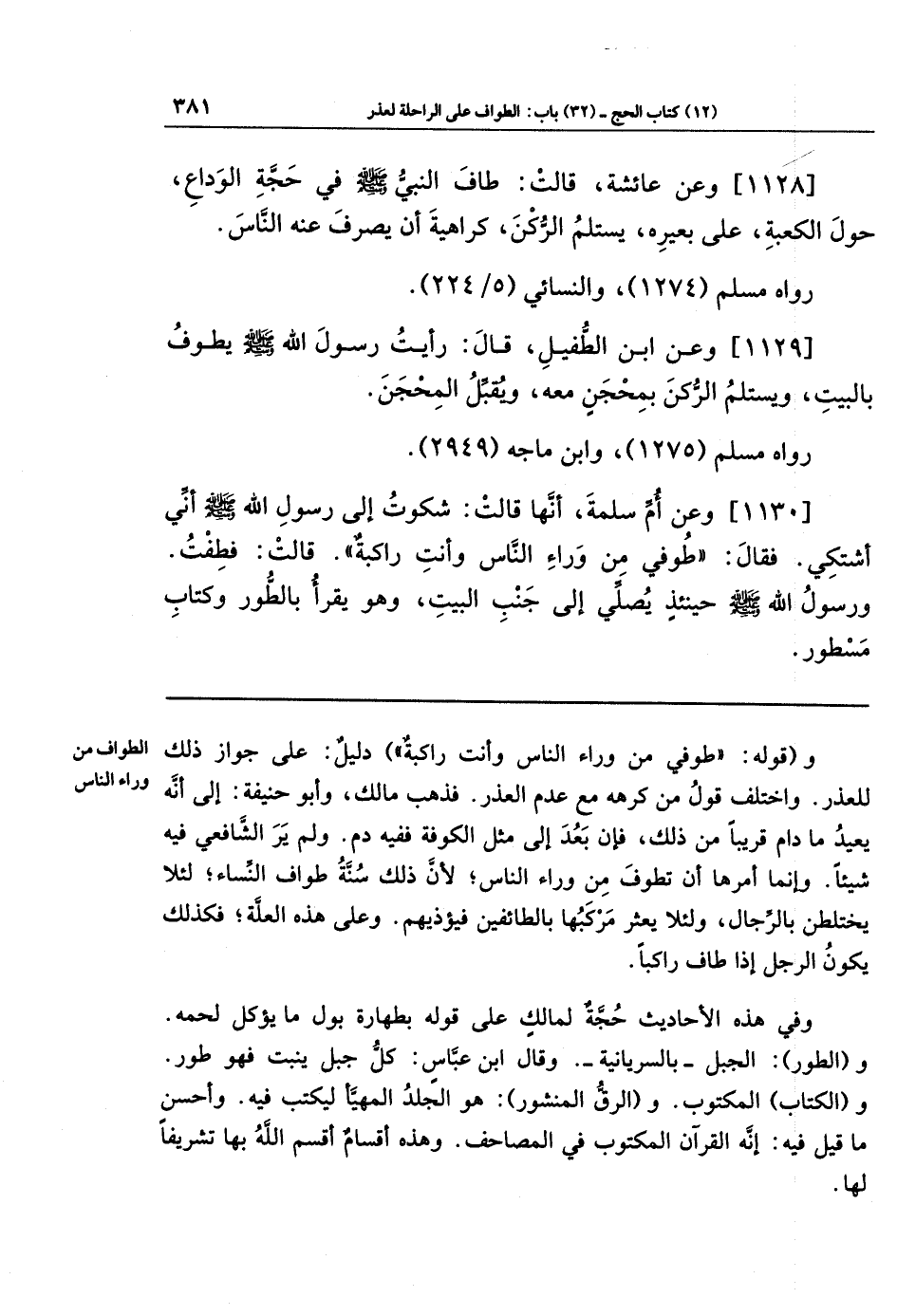 [1130] وعَن أُمِّ سَلَمَةَ أَنَّهَا قَالَت: شَكَوتُ إِلَى رَسُولِ اللَّهِ -صَلَّى اللَّهُ عَلَيهِ وَسَلَّمَ- أَنِّي أَشتَكِي، فَقَالَ: طُوفِي مِن وَرَاءِ النَّاسِ، وَأَنتِ رَاكِبَةٌ. قَالَت: فَطُفتُ وَرَسُولُ اللَّهِ -صَلَّى اللَّهُ عَلَيهِ وَسَلَّمَ- حِينَئِذٍ يُصَلِّي إِلَى جَنبِ البَيتِ، وَهُوَ يَقرَأُ بِالطُّورِ وَكِتَابٍ مَسطُورٍ.