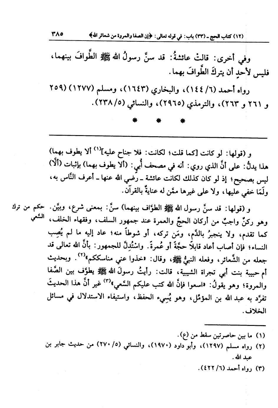 وقولها: (قد سن رسول الله - صلى الله عليه وسلم - الطواف بينهما)؛ سن: بمعنى شرع وبيَّن. وهو ركن واجب من أركان الحج والعمرة عند جمهور السلف، وفقهاء الخلف، كما تقدم، ولا ينجبر بالدَّم، ومن تركه، أو شوطًا منه؛ عاد إليه ما لم يُصِب النساء؛ فإن أصاب أعاد قابلاً حجة أو عمرة. واستدل الجمهور: بأن الله تعالى قد جعله من الشعائر، وفعله النبي - صلى الله عليه وسلم -، وقال: (خذوا عني مناسككم) (¬2) وبحديث أم حبيبة بنت أبي تجراة الشيبية، قالت: رأيت رسول الله - صلى الله عليه وسلم - يطوف بين الصفا والمروة، وهو يقول: (اسعوا فإن الله كتب عليكم السعي) (¬3) غير أن هذا الحديث تفرَّد به عبد الله بن المؤمِّل، وهو يسيء الحفظ، واستيفاء الاستدلال في مسائل الخلاف.