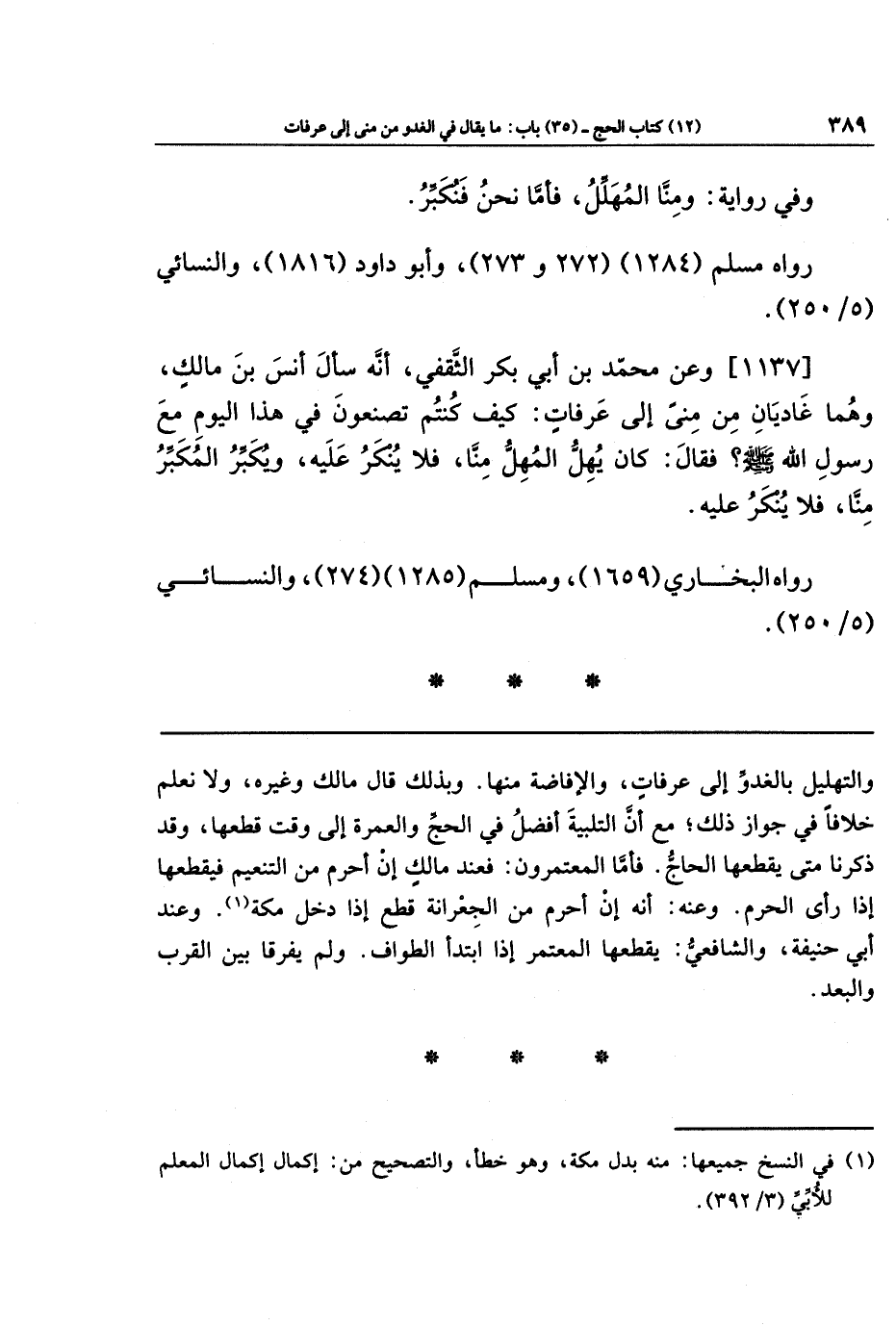 [1137] وعَن مُحَمَّدِ بنِ أَبِي بَكرٍ الثَّقَفِيِّ أَنَّهُ سَأَلَ أَنَسَ بنَ مَالِكٍ وَهُمَا غَادِيَانِ مِن مِنًى إِلَى عَرَفَات: كَيفَ كُنتُم تَصنَعُونَ فِي هَذَا اليَومِ مَعَ رَسُولِ اللَّهِ -صَلَّى اللَّهُ عَلَيهِ وَسَلَّمَ-؟ فَقَالَ: كَانَ يُهِلُّ المُهِلُّ مِنَّا فَلَا يُنكَرُ عَلَيهِ، وَيُكَبِّرُ المُكَبِّرُ مِنَّا، فَلَا يُنكَرُ عَلَيهِ.
