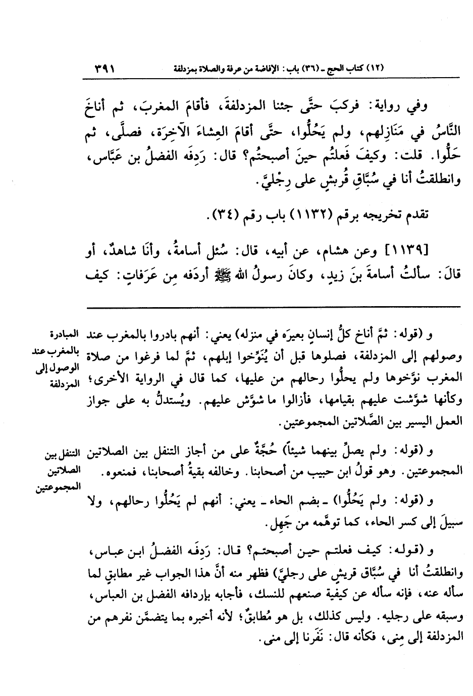 وَفِي رِوَايَةٍ: فَرَكِبَ حَتَّى جِئنَا المُزدَلِفَةَ، فَأَقَامَ المَغرِبَ، ثُمَّ أَنَاخَ النَّاسُ فِي مَنَازِلِهِم، وَلَم يَحُلُّوا حَتَّى أَقَامَ العِشَاءَ الآخِرَةَ فَصَلَّى، ثُمَّ حَلُّوا قُلتُ: وَكَيفَ فَعَلتُم حِينَ أَصبَحتُم؟ قَالَ: رَدِفَهُ الفَضلُ بنُ عَبَّاسٍ، وَانطَلَقتُ أَنَا فِي سُبَّاقِ قُرَيشٍ عَلَى رِجلَيَّ.