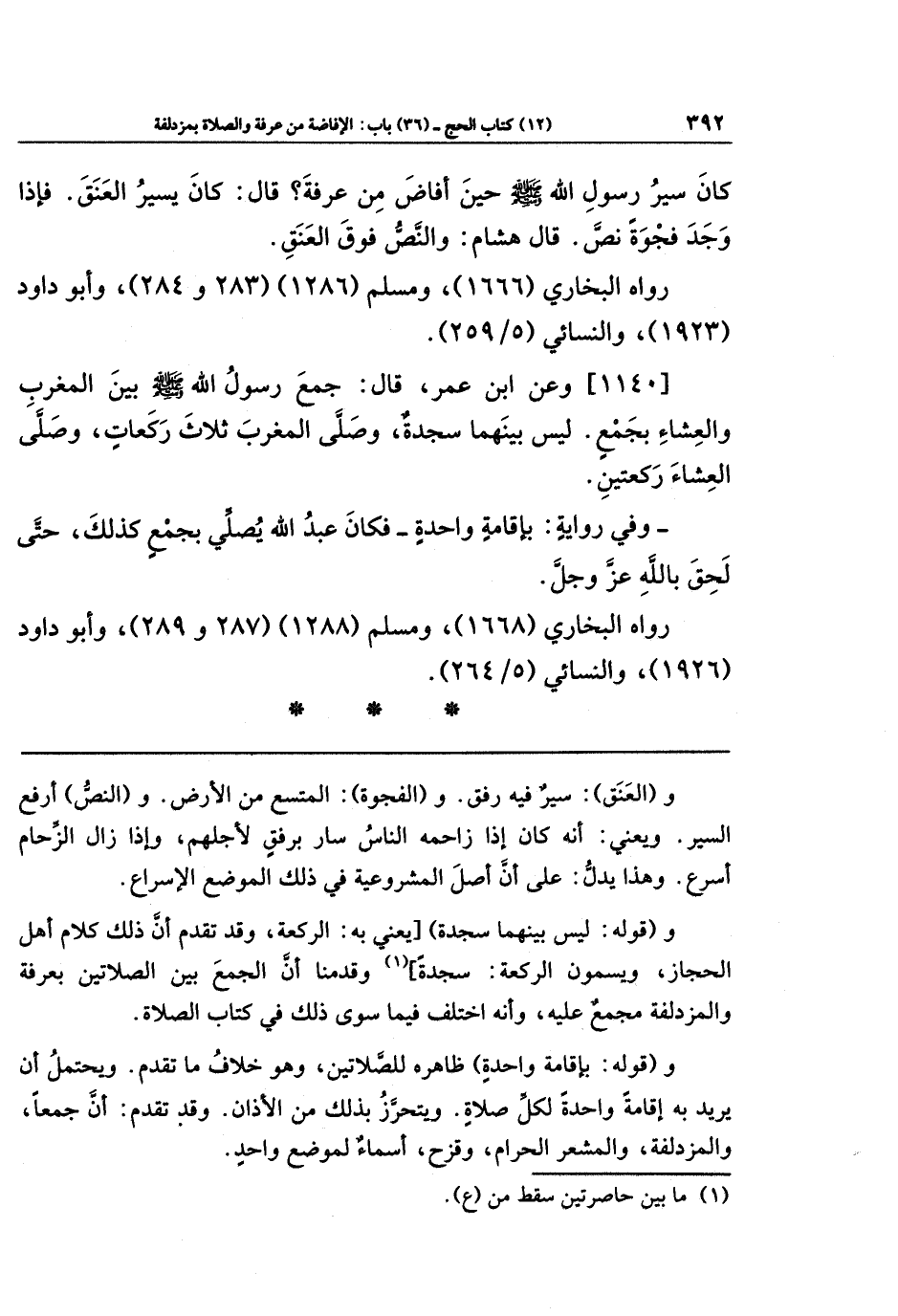 و(العَنَق): سيرٌ فيه رفق. و (الفجوة): المتسع من الأرض. و (النص): أرفع السير؛ ويعني: أنه كان إذا زاحمه الناس سار برفق لأجلهم، وإذا زال الزحام أسرع. وهذا يدل: على أن أصل المشروعية في ذلك الموضع الإسراع.