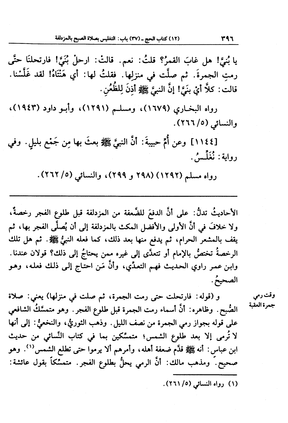 يَا بُنَيَّ هَل غَابَ القَمَرُ؟ قُلتُ: نَعَم قَالَت: ارحَل بنِي! فَارتَحَلنَا حَتَّى رَمَت الجَمرَةَ، ثُمَّ صَلَّت فِي مَنزِلِهَا. فَقُلتُ: لَهَا أَي هَنتَاه لَقَد غَلَّسنَا قَالَت: كَلَّا أَي بُنَيَّ! إِنَّ النَّبِيَّ -صَلَّى اللَّهُ عَلَيهِ وَسَلَّمَ- أَذِنَ لِلظُّعُنِ.