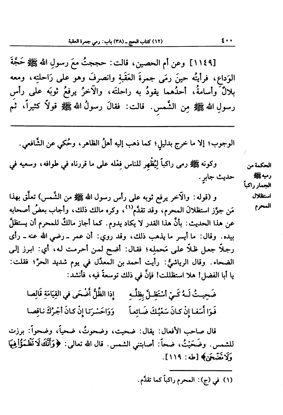 و(قوله: (والآخر يرفع ثوبه على رأس رسول الله - صلى الله عليه وسلم - من الشمس)؛ تعلق بهذا من جوَّز المحرم، وقد تقدَّم (¬1)، وكره مالك ذلك، وأجاب بعض أصحابه عن هذا الحديث: بأن هذا القدر لا يكاد يدوم. كما أجاز مالك للمحرم أن يستظل بيده. وقال: ما أيسر ما يذهب ذلك، وقد روي: أن عمر رضي الله عنه رأى رجلاً جعل ظلاً على مَحمَلِه؛ فقال: أضح لمن أحرمت له، أي: ابرز إلى الضحاء. وقال الرياشيّ: رأيت أحمد بن المعدِّل في يوم شديد الحرِّ، فقلت: يا أبا الفضل! هلا استظللت! فإن في ذلك توسعة فيه، فأنشد: