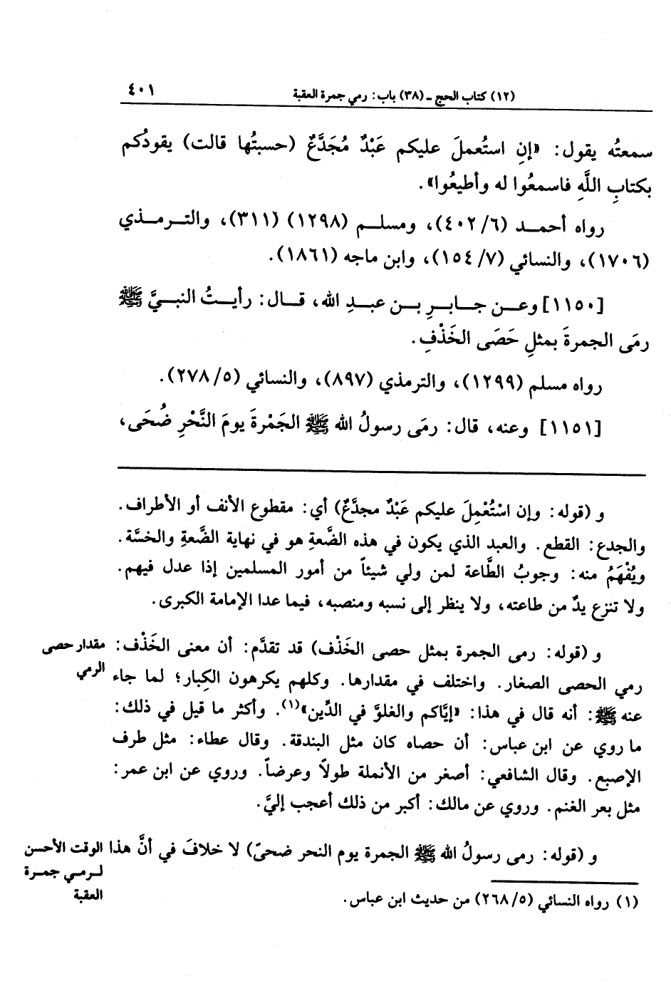 [1150] وعن جَابِرَ بنَ عَبدِ اللَّهِ قال: رَأَيتُ النَّبِيَّ -صَلَّى اللَّهُ عَلَيهِ وَسَلَّمَ- رَمَى الجَمرَةَ بِمِثلِ حَصَى الخَذفِ.