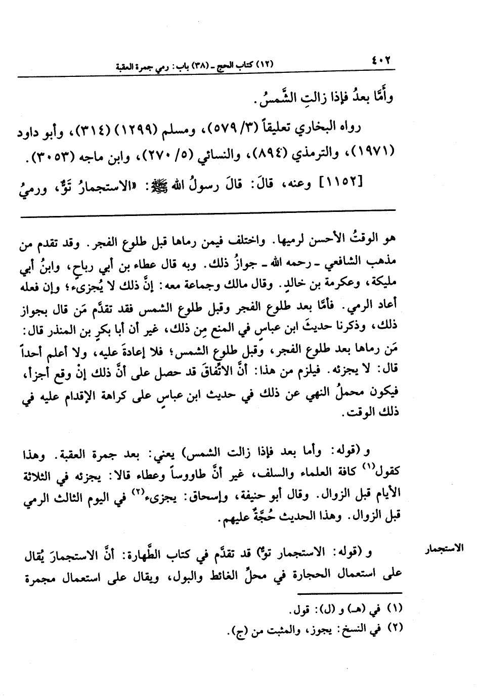 وقوله: (الاستجمار توٌّ)؛ قد تقدَّم في كتاب الطهارة: أن الاستجمار يُقال على استعمال الحجارة في محل الغائط والبول، ويقال على استعمال مجمرة