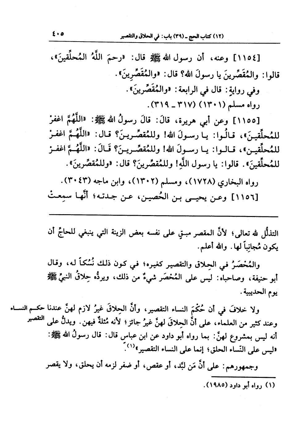 [1155] وعَن أَبِي هُرَيرَةَ قَالَ: قَالَ رَسُولُ اللَّهِ -صَلَّى اللَّهُ عَلَيهِ وَسَلَّمَ-: اللَّهُمَّ اغفِر لِلمُحَلِّقِينَ قَالُوا: يَا رَسُولَ اللَّهِ! وَلِلمُقَصِّرِينَ؟ قَالَ: اللَّهُمَّ اغفِر لِلمُحَلِّقِينَ. قَالُوا: يَا رَسُولَ اللَّهِ! وَلِلمُقَصِّرِينَ؟ قَالَ: اللَّهُمَّ اغفِر لِلمُحَلِّقِينَ. قَالُوا: يَا رَسُولَ اللَّهِ! وَلِلمُقَصِّرِينَ؟ قَالَ: وَلِلمُقَصِّرِينَ.