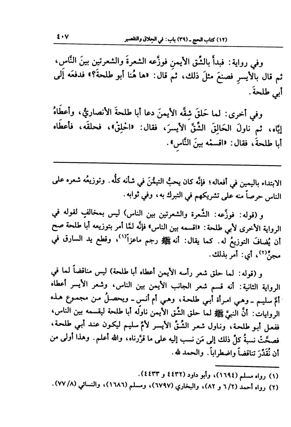 وفي أخرى: لما حلق شِقَّهُ الأَيمَنَ دَعَا أَبَا طَلحَةَ الأَنصَارِيَّ، وَأَعطَاهُ إِيَّاهُ، ثُمَّ نَاوَلَ الحالق الشِّقَّ الأَيسَرَ، فَقَالَ: احلِق فَحَلَقَهُ، فَأَعطَاهُ أَبَا طَلحَةَ، فَقَالَ: اقسِمهُ بَينَ النَّاسِ.
