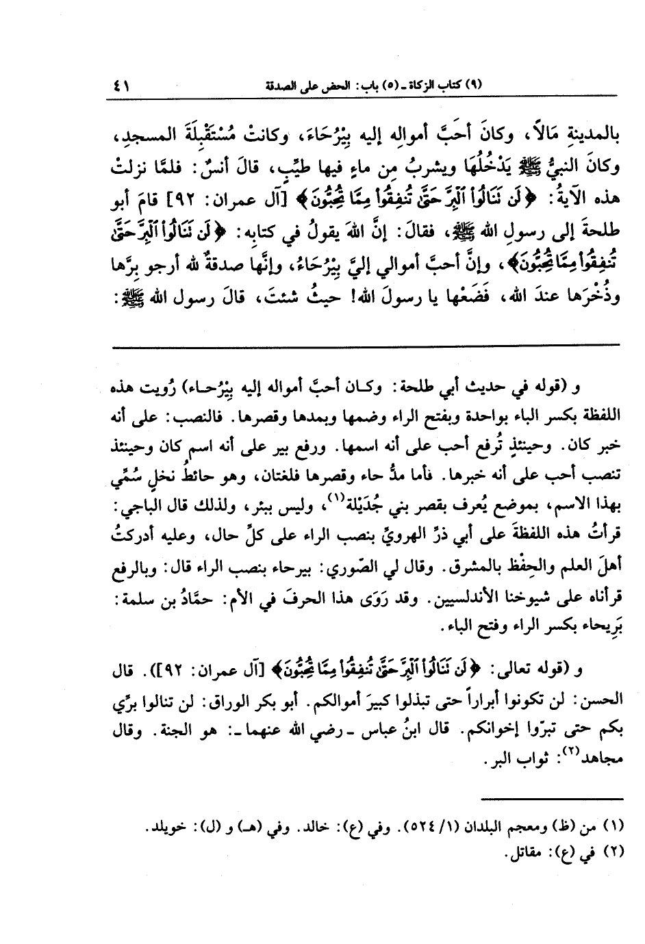 بِالمَدِينَةِ مَالاً، وَكَانَ أَحَبُّ أَموَالِهِ إِلَيهِ بَيرَحَاء وَكَانَت مُستَقبِلَةَ المَسجِدِ، وَكَانَ النَّبِيُّ - صلى الله عليه وسلم - يَدخُلُهَا وَيَشرَبُ مِن مَاءٍ فِيهَا طَيِّبٍ، قَالَ أَنَسٌ: فَلَمَّا نَزَلَت هَذِهِ الآيَةُ: {لَن تَنَالُوا البِرَّ حَتَّى تُنفِقُوا مِمَّا تُحِبُّونَ} قَامَ أَبُو طَلحَةَ إِلَى رَسُولِ اللهِ - صلى الله عليه وسلم -، فَقَالَ: إِنَّ اللهَ يَقُولُ فِي كِتَابِهِ: {لَن تَنَالُوا البِرَّ حَتَّى تُنفِقُوا مِمَّا تُحِبُّونَ} وَإِنَّ أَحَبَّ أَموَالِي إِلَيَّ بَيرَحَاء، وَإِنَّهَا صَدَقَةٌ لِلَّهِ أَرجُو بِرَّهَا وَذُخرَهَا عِندَ اللهِ، فَضَعهَا يَا رَسُولَ اللهِ! حيث شِئتَ، قَالَ رَسُولُ اللهِ - صلى الله عليه وسلم -: