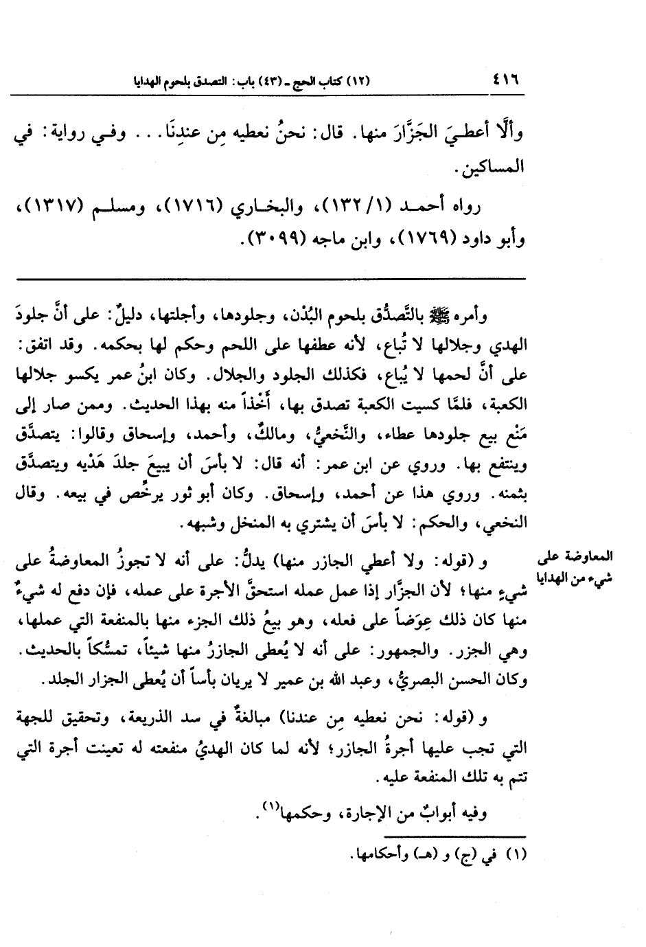وَأَلَّا أُعطِيَ الجَزَّارَ مِنهَا قَالَ: نَحنُ نُعطِيهِ مِن عِندِنَا. . . وَفِي رِوَايَةٍ: في المساكين.