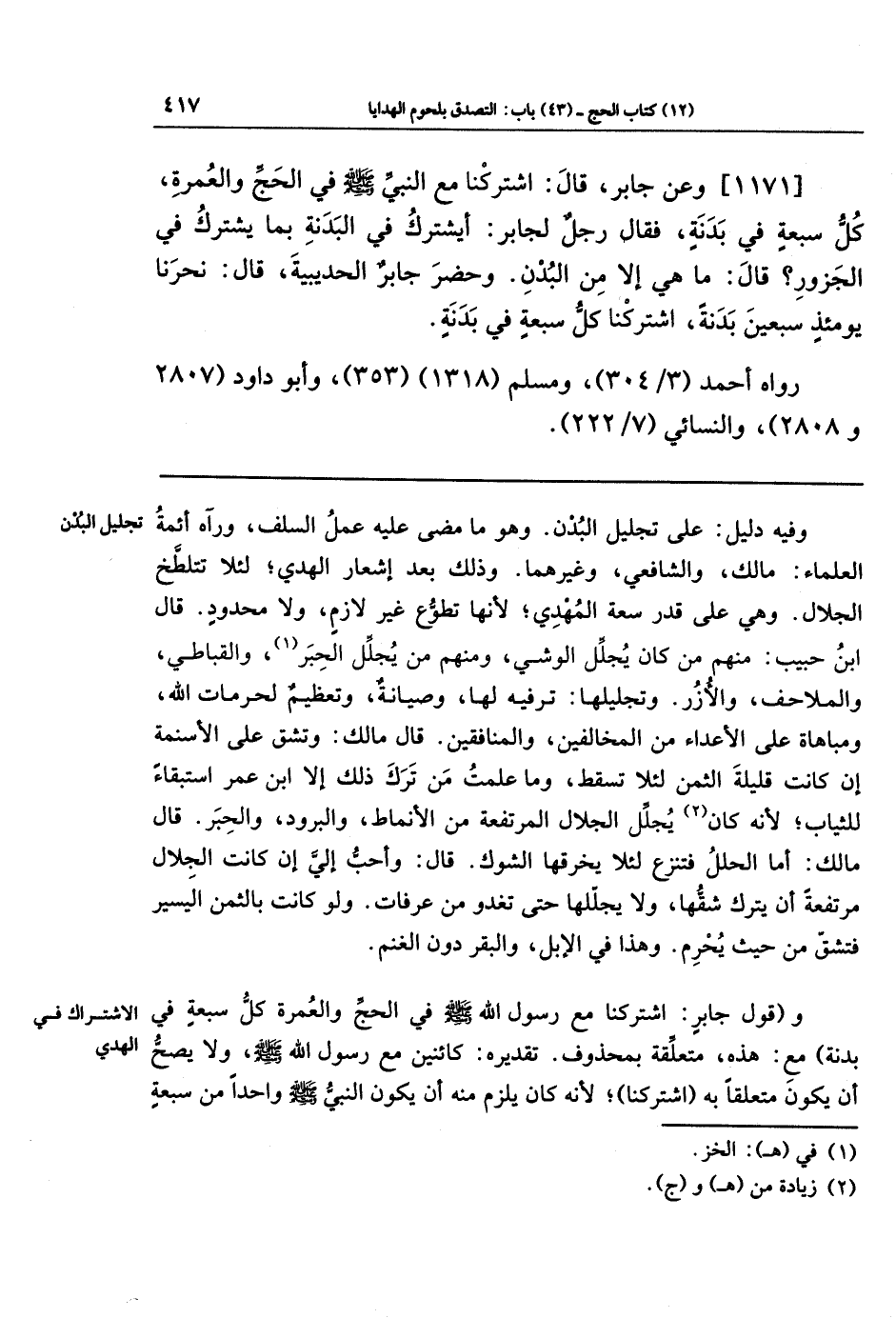 [1171] وَعَن جَابِرَ قَالَ: اشتَرَكنَا مَعَ النَّبِيِّ -صَلَّى اللَّهُ عَلَيهِ وَسَلَّمَ- فِي الحَجِّ، وَالعُمرَةِ كُلُّ سَبعَةٍ فِي بَدَنَةٍ، فَقَالَ رَجُلٌ لِجَابِرٍ: أَيُشتَرَكُ فِي البَدَنَةِ بمَا يُشتَرَكُ فِي الجَزُورِ؟ قَالَ: مَا هِيَ إِلَّا مِن البُدنِ، وَحَضَرَ جَابِرٌ الحُدَيبِيَةَ قَالَ: نَحَرنَا يَومَئِذٍ سَبعِينَ بَدَنَةً، اشتَرَكنَا كُلُّ سَبعَةٍ فِي بَدَنَةٍ.