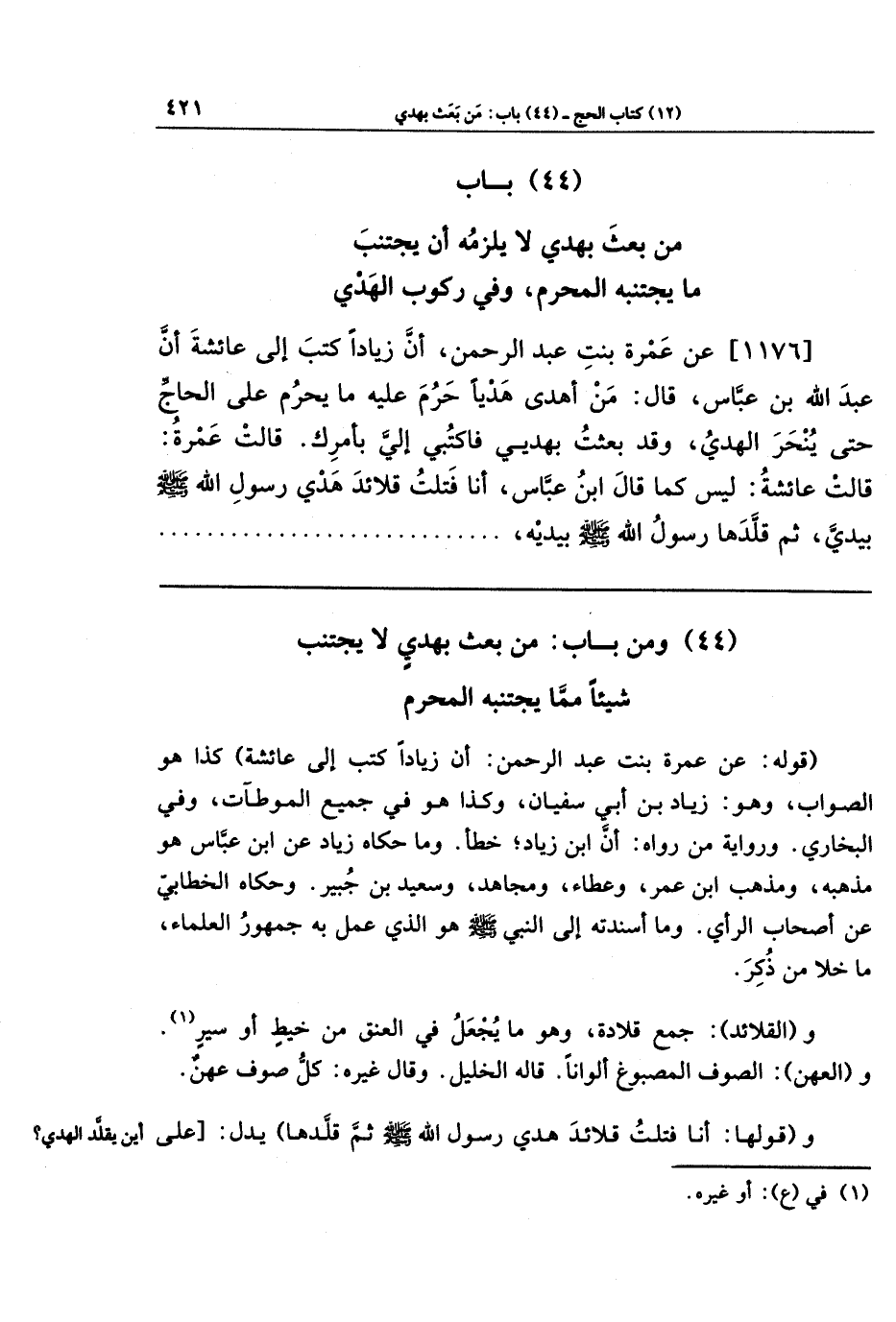 [1176] عَن عَمرَةَ بِنتِ عَبدِ الرَّحمَنِ أَنَّ زِيَادا كَتَبَ إِلَى عَائِشَةَ أَنَّ عَبدَ اللَّهِ بنَ عَبَّاسٍ قَالَ: مَن أَهدَى هَديًا حَرُمَ عَلَيهِ مَا يَحرُمُ عَلَى الحَاجِّ حَتَّى يُنحَرَ الهَديُ، وَقَد بَعَثتُ بِهَديِي فَاكتُبِي إِلَيَّ بِأَمرِكِ. قَالَت عَمرَةُ: قَالَت عَائِشَةُ: لَيسَ كَمَا قَالَ ابنُ عَبَّاسٍ، أَنَا فَتَلتُ قَلَائِدَ هَديِ رَسُولِ اللَّهِ -صَلَّى اللَّهُ عَلَيهِ وَسَلَّمَ- بِيَدَيَّ، ثُمَّ قَلَّدَهَا رَسُولُ اللَّهِ -صَلَّى اللَّهُ عَلَيهِ وَسَلَّمَ- بِيَدِيهِ،