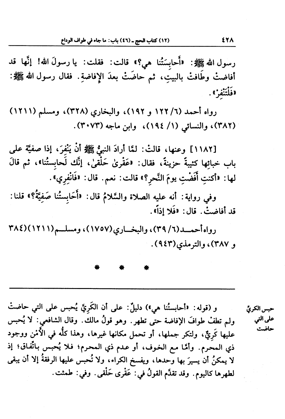 وِفي رواية: أَنَّهُ عَلَيهِ الصلاة والسلام قال: أحابستنا صفية؟ قلنا: قد أفاضت. قال: فلا إذا.