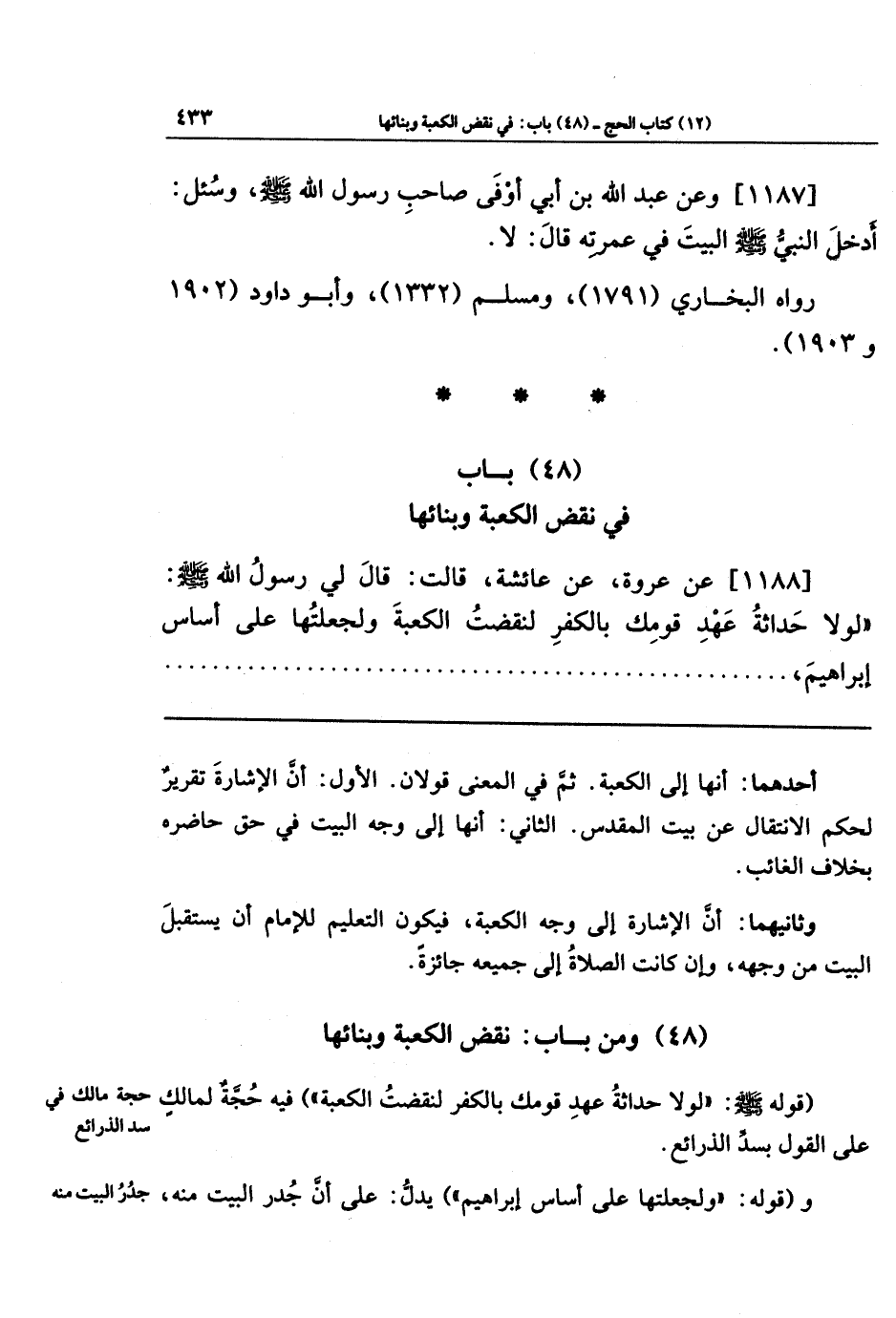 [1188] عَن عُروَةَ، عَن عَائِشَةَ قَالَت: قَالَ لِي رَسُولُ اللَّهِ -صَلَّى اللَّهُ عَلَيهِ وَسَلَّمَ-: لَولَا حَدَاثَةُ عَهدِ قَومِكِ بِالكُفرِ لَنَقَضتُ الكَعبَةَ وَلَجَعَلتُهَا عَلَى أَسَاسِ إِبرَاهِيمَ