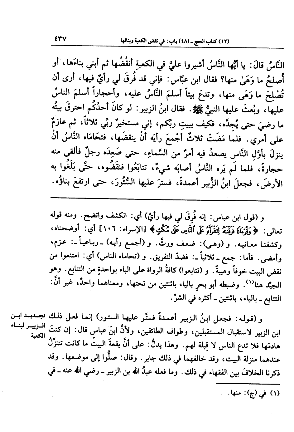 وقوله: (فجعل ابن الزبير أعمدة فستَّر عليها الستور)؛ إنما فعل ذلك ابن الزبير لاستقبال المستقبلين، وطواف الطائفين، ولأن ابن عباس قال: (إن كنتَ هادمَها فلا تدع الناس لا قِبلة لهم. وهذا يدل على أن بقعة البيت ما كانت تتنزَّل عندهما منزلة البيت، وقد خالفهما في ذلك جابر وقال: صلوا إلى موضعها. وقد ذكرنا الخلاف بين الفقهاء في ذلك. وما فعله عبد الله بن الزبير -رضي الله عنه- في