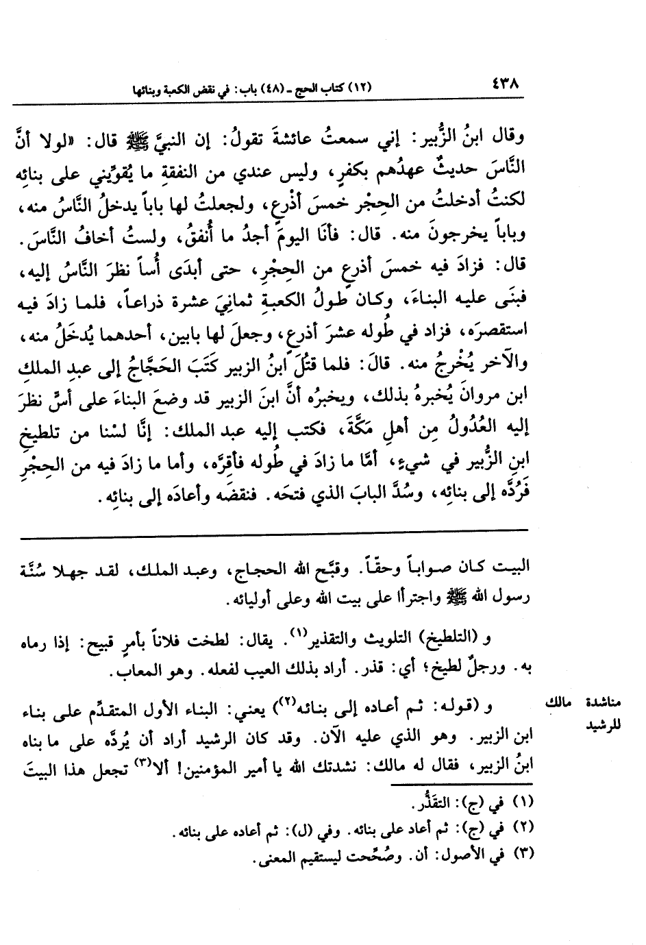 وقوله: (ثم أعاده إلى بنائه (¬2))؛ يعني: البناء الأول المتقدِّم على بناء ابن الزبير. وهو الذي عليه الآن. وقد كان الرشيد أراد أن يرده على ما بناه ابن الزبير، فقال له مالك: نشدتك الله يا أمير المؤمنين! ألا (¬3) تجعل هذا البيت