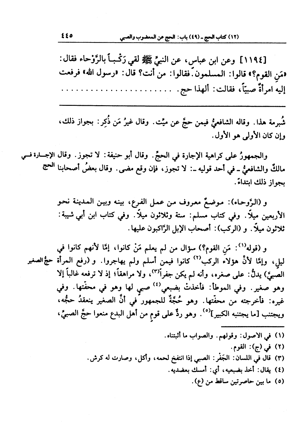 [1194] وعَن ابنِ عَبَّاسٍ عَن النَّبِيِّ -صَلَّى اللَّهُ عَلَيهِ وَسَلَّمَ- لَقِيَ رَكبًا بِالرَّوحَاءِ فَقَالَ: مَن القَومُ؟ قَالُوا: المُسلِمُونَ فَقَالُوا: مَن أَنتَ؟ قَالَ: رَسُولُ اللَّهِ. فَرَفَعَت إِلَيهِ امرَأَةٌ صَبِيًّا فَقَالَت: أَلِهَذَا حَجٌّ