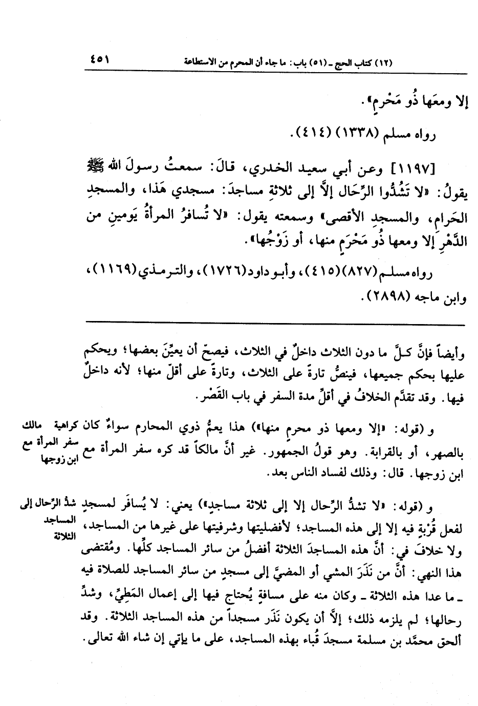 [1197] وعَن أَبِي سَعِيدٍ الخدري قَالَ: سَمِعتُ رَسُولَ اللَّهِ -صَلَّى اللَّهُ عَلَيهِ وَسَلَّمَ- يَقُولُ: لَا تَشُدُّوا الرِّحَالَ إِلَّا إِلَى ثَلَاثَةِ مَسَاجِدَ؛ مَسجِدِي هَذَا، وَالمَسجِدِ الحَرَامِ، وَالمَسجِدِ الأَقصَى. وَسَمِعتُهُ يَقُولُ: لَا تُسَافِر المَرأَةُ يَومَينِ مِن الدَّهرِ إِلَّا وَمَعَهَا ذُو مَحرَمٍ مِنهَا أَو زَوجُهَا.