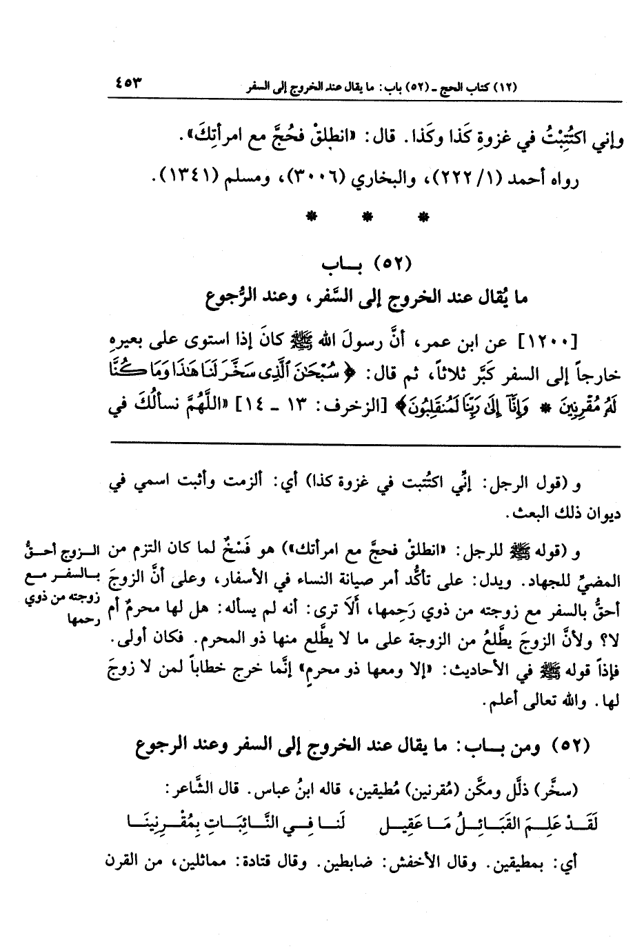 [1200] عن ابنَ عُمَرَ أَنَّ رَسُولَ اللَّهِ -صَلَّى اللَّهُ عَلَيهِ وَسَلَّمَ- كَانَ إِذَا استَوَى عَلَى بَعِيرِهِ خَارِجًا إِلَى السَفَرٍ كَبَّرَ ثَلَاثًا، ثُمَّ قَالَ: سُبحَانَ الَّذِي سَخَّرَ لَنَا هَذَا وَمَا كُنَّا لَهُ مُقرِنِينَ وَإِنَّا إِلَى رَبِّنَا لَمُنقَلِبُونَ، اللَّهُمَّ نَسأَلُكَ فِي