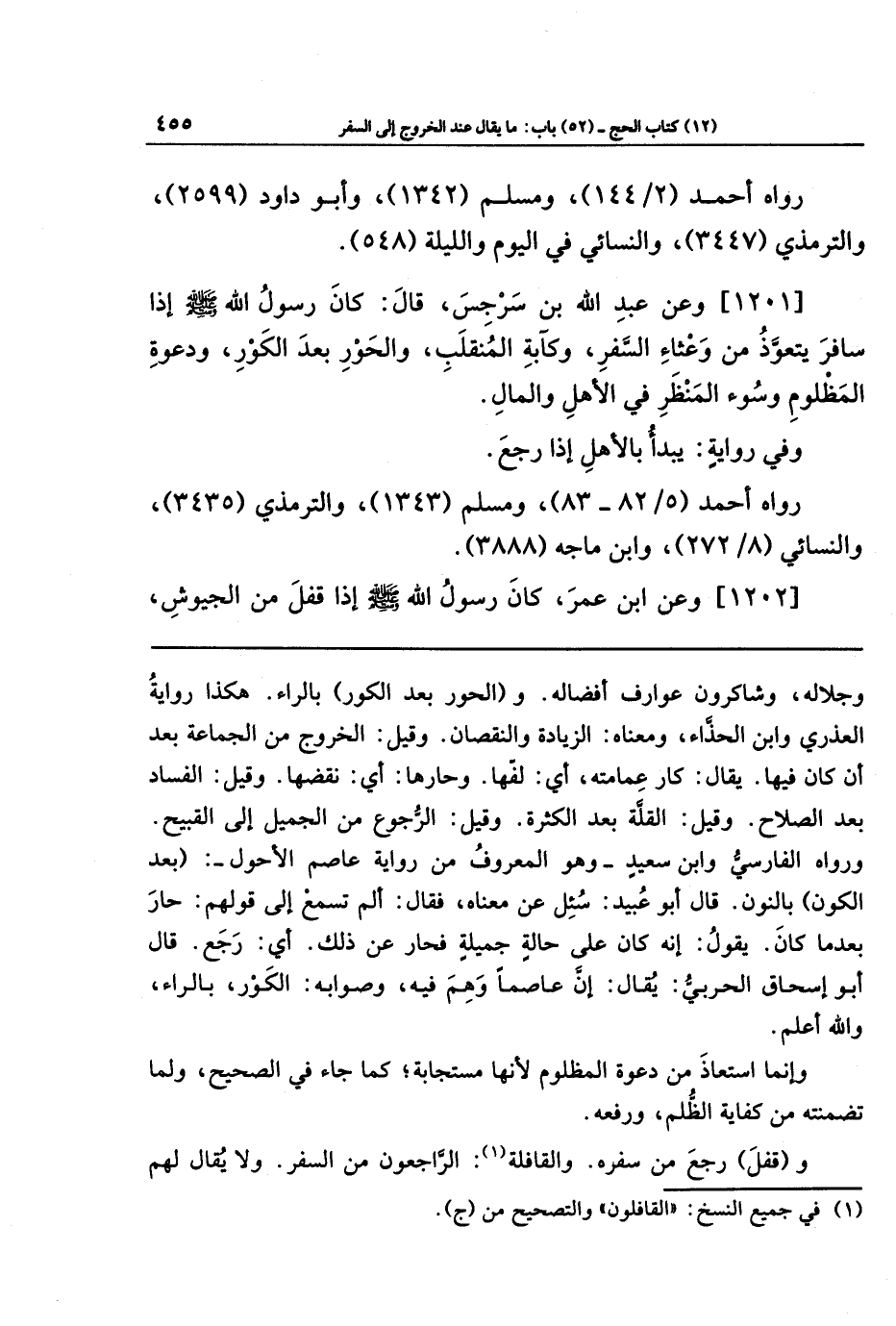 [1201] وعَن عَبدِ اللَّهِ بنِ سَرجِسَ قَالَ: كَانَ رَسُولُ اللَّهِ -صَلَّى اللَّهُ عَلَيهِ وَسَلَّمَ- إِذَا سَافَرَ يَتَعَوَّذُ مِن وَعثَاءِ السَّفَرِ وَكَآبَةِ المُنقَلَبِ، وَالحَورِ بَعدَ الكَورِ، وَدَعوَةِ المَظلُومِ، وَسُوءِ المَنظَرِ فِي الأَهلِ وَالمَالِ.