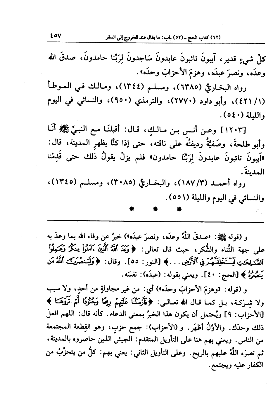 [1203] وعن أَنَسُ بنُ مَالِكٍ قال: أَقبَلنَا مَعَ النَّبِيِّ -صَلَّى اللَّهُ عَلَيهِ وَسَلَّمَ- أَنَا وَأَبُو طَلحَةَ وَصَفِيَّةُ رَدِيفَتُهُ عَلَى نَاقَتِهِ، حَتَّى إِذَا كُنَّا بِظَهرِ المَدِينَةِ قَالَ: آيِبُونَ تَائِبُونَ عَابِدُونَ لِرَبِّنَا حَامِدُونَ. فَلَم يَزَل يَقُولُ ذَلِكَ حَتَّى قَدِمنَا المَدِينَةَ.