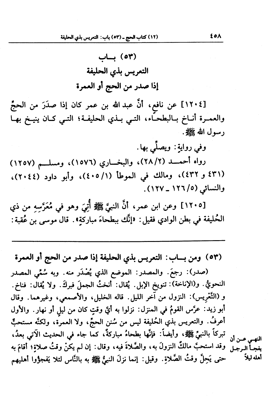 [1204] عَن نَافِعٍ أَنَّ عَبدَ اللَّهِ بنَ عُمَرَ كَانَ إِذَا صَدَرَ مِن الحَجِّ والعُمرَةِ أَنَاخَ بِالبَطحَاءِ الَّتِي بِذِي الحُلَيفَةِ، الَّتِي كَانَ يُنِيخُ بِهَا رَسُولُ اللَّهِ صَلَّى اللَّهُ عَلَيهِ وَسَلَّمَ.