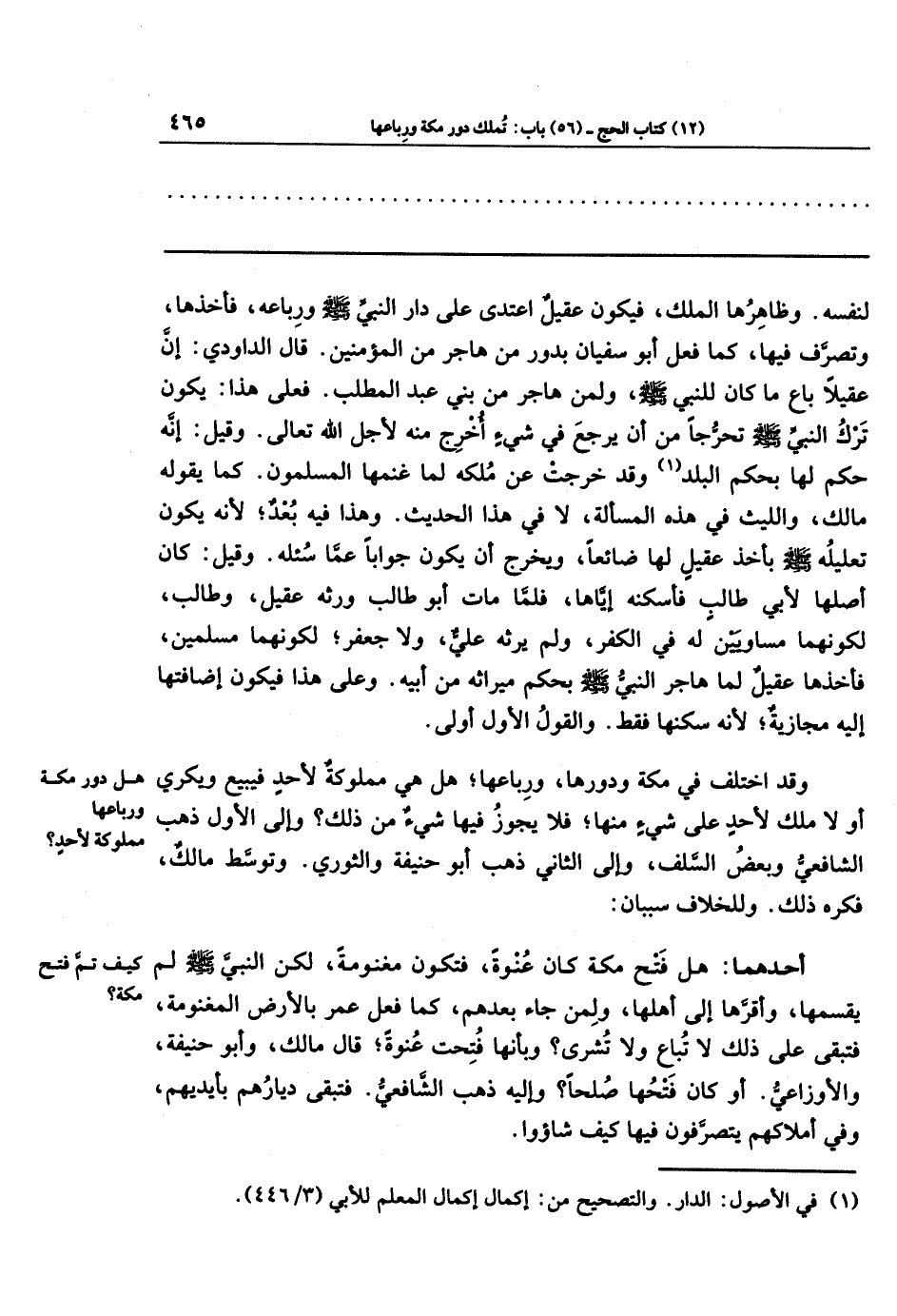 أحدهما: هل فتح مكة كان عُنوة فتكون مغنومة، لكن النبي - صلى الله عليه وسلم - لم يقسمها وأقرها إلى أهلها ولمن جاء بعدهم، كما فعل عمر بالأرض المغنومة، فتبقى على ذلك لا تباع ولا تُشرى؟ وبأنها فتحت عُنوة - قال مالك وأبو حنيفة والأوزاعي، أو كان فتحها صُلحًا؟ وإليه ذهب الشافعي. فتبقى ديارهم بأيديهم وفي أملاكهم يتصرفون فيها كيف شاؤوا.