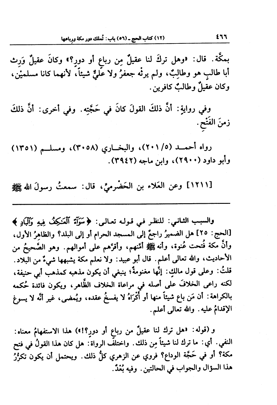 بِمَكَّةَ؟ قَالَ: وَهَل تَرَكَ لَنَا عَقِيلٌ مِن رِبَاعٍ أَو دُورٍ؟ وَكَانَ عَقِيلٌ وَرِثَ أَبَا طَالِبٍ هُوَ وَطَالِبٌ، وَلَم يَرِثهُ جَعفَرٌ وَلَا عَلِيٌّ شَيئًا لِأَنَّهُمَا كَانَا مُسلِمَينِ، وَكَانَ عَقِيلٌ وَطَالِبٌ كَافِرَينِ.