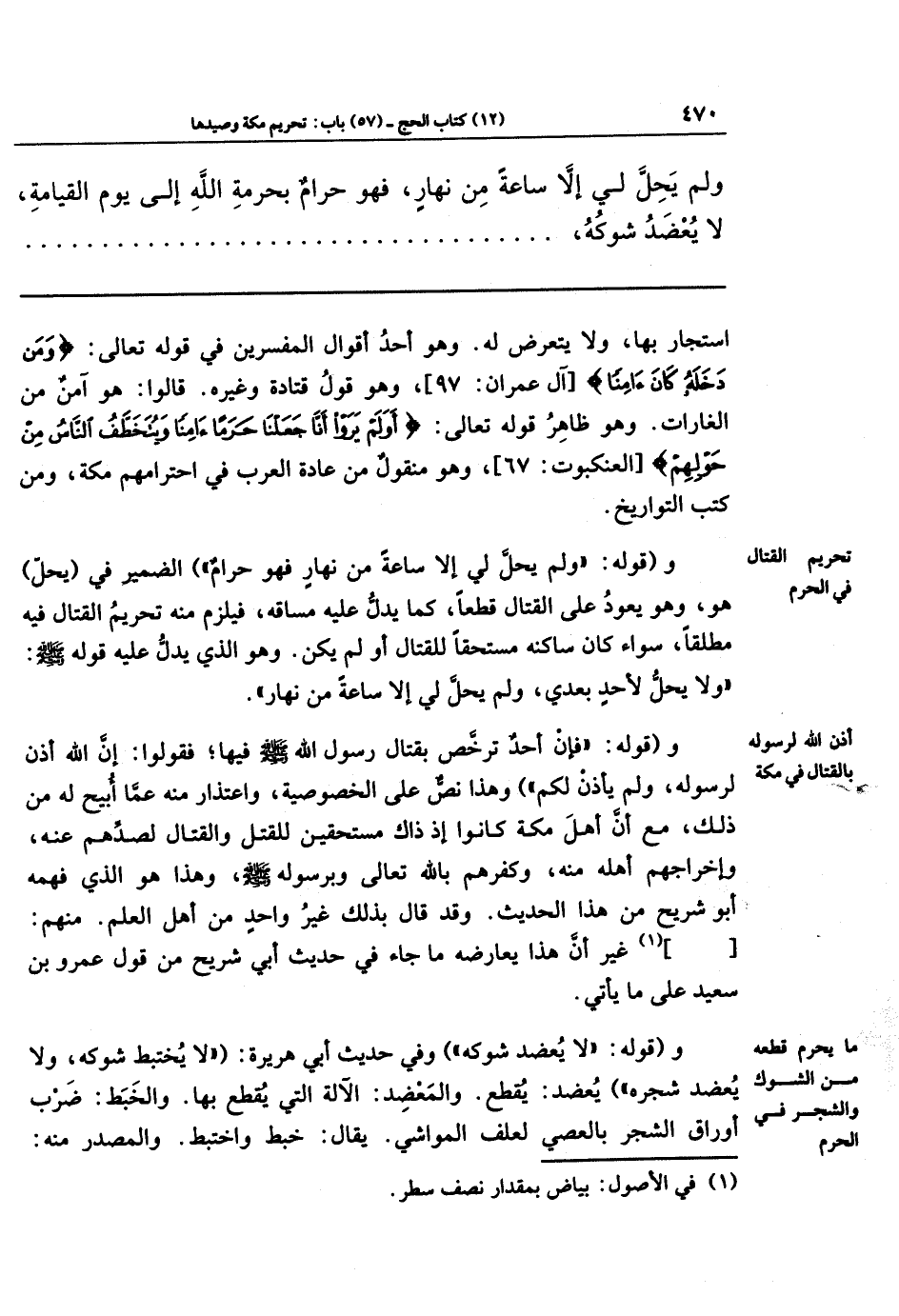 وقوله ولم يحل لي إلا ساعة من نهار فهو حرامٌ، الضمير في يحل هو، وهو يعودُ على القتال قطعًا كما يدل عليه مساقه، فيلزم منه تحريم القتال فيه مطلقًا، سواء كان ساكنه مستحقًا للقتال أو لم يكن، وهو الذي يدل عليه قوله صلى الله عليه وسلم: ولا يحل لأحد بعدي، ولم يحل لي إلا ساعة من نهار.