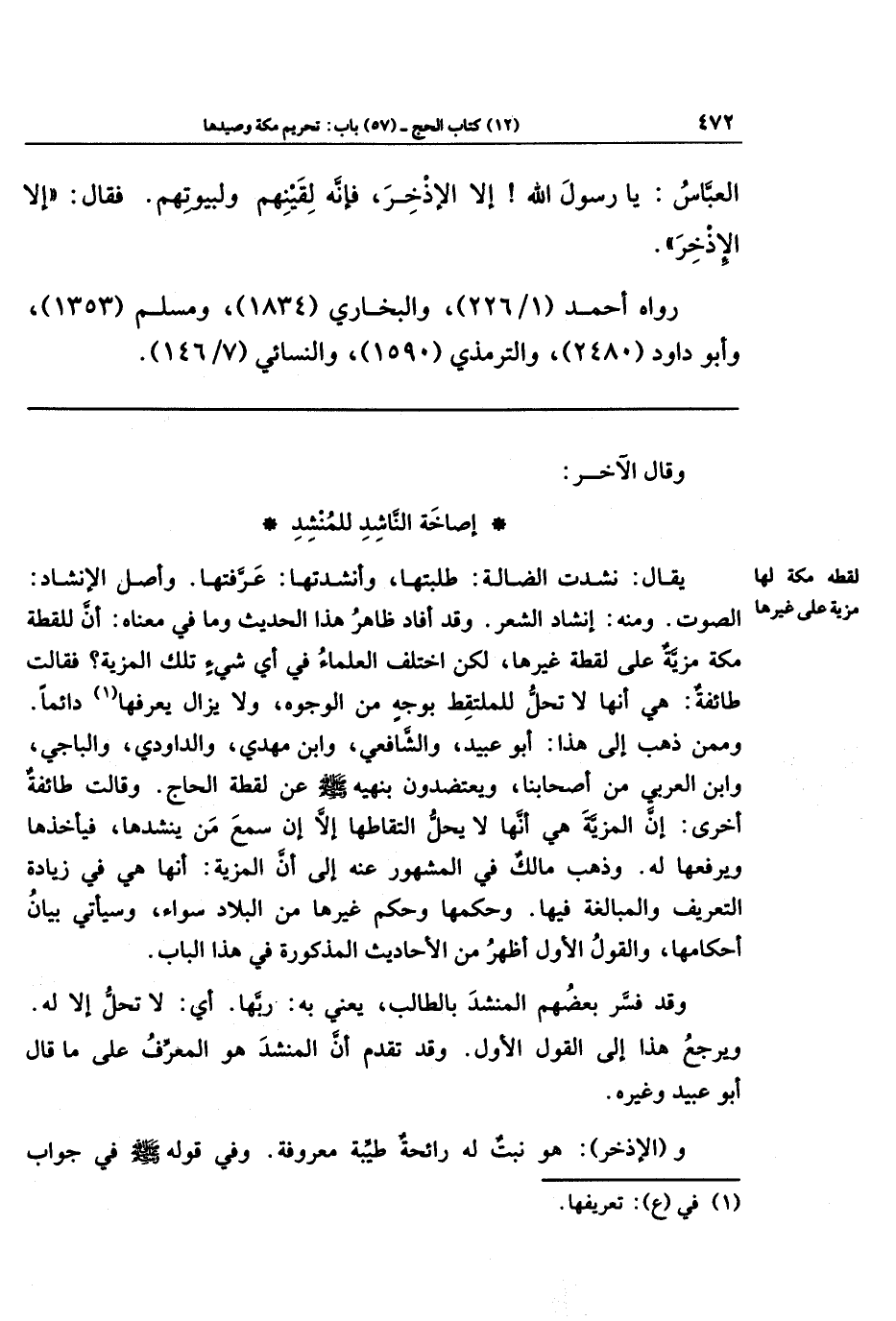 يقال: نشدت الضالة طلبتها، وأنشدتها عَرَّفتها. وأصل الإنشاد الصوت، ومنه إنشاد الشعر. وقد أفاد ظاهر هذا الحديث وما في معناه أن للقطة مكة مزية على لقطة غيرها، لكن اختلف العلماء في أي شيء تلك المزية؟ فقالت طائفة: هي أنها لا تحل للملتقط بوجه من الوجوه، ولا يزال يعرفها (¬1) دائمًا. وممن ذهب إلى هذا: أبو عبيد، والشافعي، وابن مهدي، والداودي، والباجي، وابن العربي من أصحابنا، ويعتضدون بنهيه - صلى الله عليه وسلم - عن لقطة الحاج. وقالت طائفة أخرى: إن المزية هي أنها لا يحل التقاطها إلا إن سمع من ينشدها، فيأخذها ويرفعها له. وذهب مالك في المشهور عنه إلى أن المزية أنها هي في زيادة التعريف والمبالغة فيها، وحكمها وحكم غيرها من البلاد سواء، وسيأتي بيان أحكامها، والقول الأول أظهر من الأحاديث المذكورة في هذا الباب.
