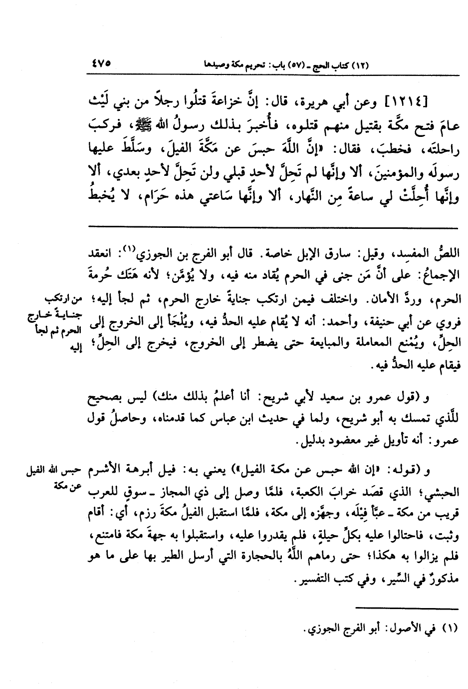 [1214] وعن أَبَي هُرَيرَةَ قال: إِنَّ خُزَاعَةَ قَتَلُوا رَجُلًا مِن بَنِي لَيثٍ عَامَ فَتحِ مَكَّةَ بِقَتِيلٍ مِنهُم قَتَلُوهُ، فَأُخبِرَ بِذَلِكَ رَسُولُ اللَّهِ صَلَّى اللَّهُ عَلَيهِ وَسَلَّمَ، فَرَكِبَ رَاحِلَتَهُ، فَخَطَبَ فَقَالَ: إِنَّ اللَّهَ حَبَسَ عَن مَكَّةَ الفِيلَ، وَسَلَّطَ عَلَيهَا رَسُولَهُ وَالمُؤمِنِينَ، أَلَا وَإِنَّهَا لَم تَحِلَّ لِأَحَدٍ قَبلِي، وَلَن تَحِلَّ لِأَحَدٍ بَعدِي، أَلَا وَإِنَّهَا أُحِلَّت لِي سَاعَةً مِن النَّهَارِ، أَلَا وَإِنَّهَا سَاعَتِي هَذِهِ حَرَامٌ، لَا يُخبَطُ