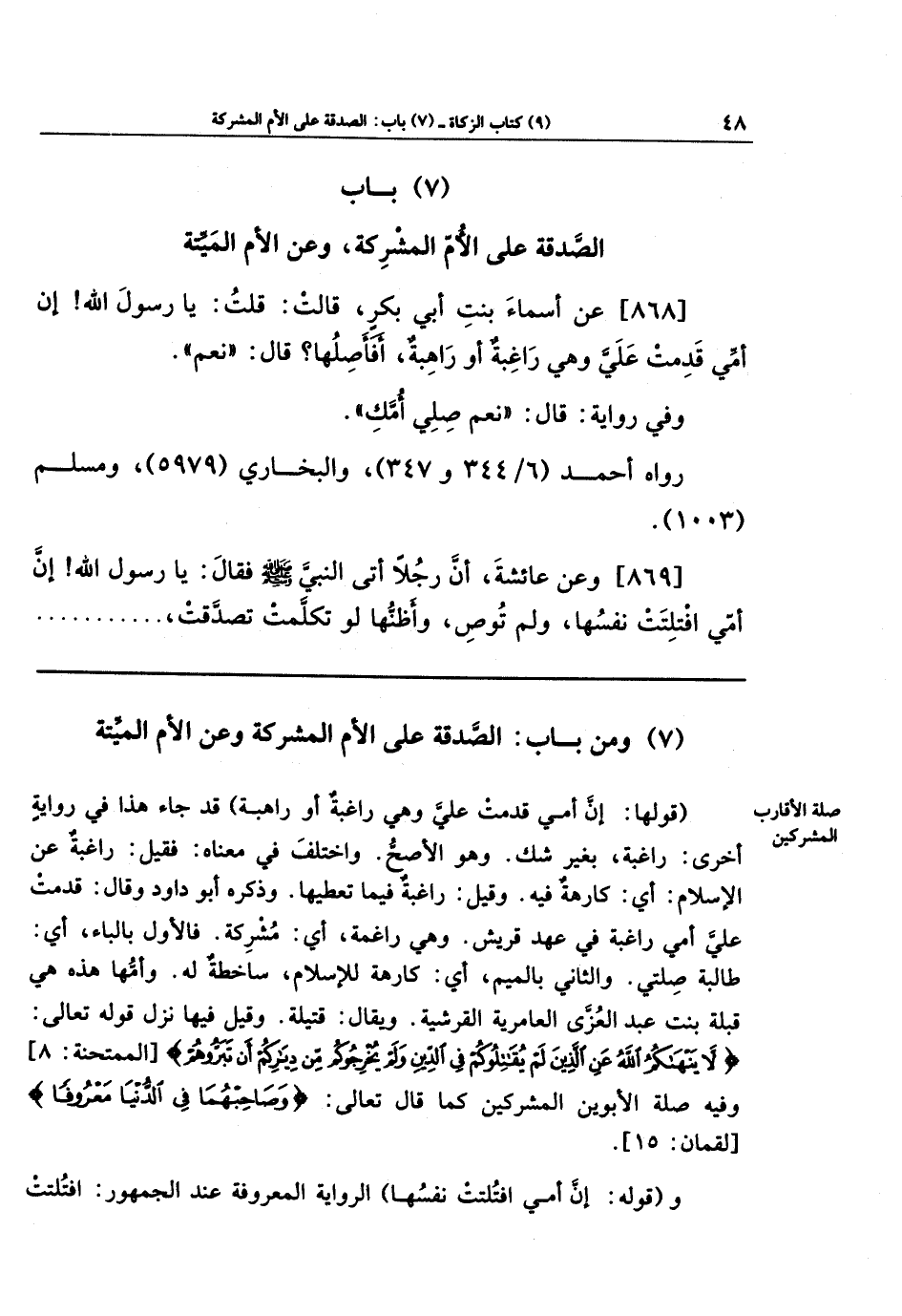 [868] عَن أَسمَاءَ بِنتِ أَبِي بَكرٍ، قَالَت: قُلتُ: يَا رَسُولَ اللهِ إِنَ أُمِّي قَدِمَت عَلَيَّ وَهِيَ رَاغِبَةٌ أَو رَاهِبَة أَفَأَصِلُهَا؟ قَالَ: (نَعَم).