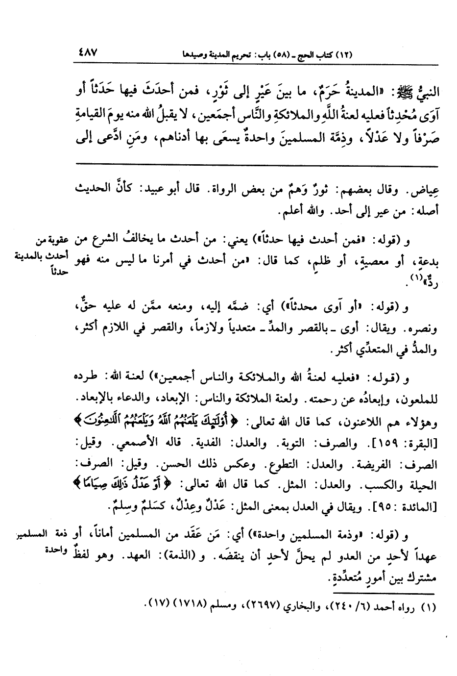 النَّبِيُّ صَلَّى اللَّهُ عَلَيهِ وَسَلَّمَ: المَدِينَةُ حَرَمٌ مَا بَينَ عَيرٍ إِلَى ثَورٍ، فَمَن أَحدَثَ فِيهَا حَدَثًا أَو آوَى مُحدِثًا فَعَلَيهِ لَعنَةُ اللَّهِ وَالمَلَائِكَةِ وَالنَّاسِ أَجمَعِينَ، لَا يَقبَلُ اللَّهُ مِنهُ يَومَ القِيَامَةِ صَرفًا وَلَا عَدلًا، وَذِمَّةُ المُسلِمِينَ وَاحِدَةٌ يَسعَى بِهَا أَدنَاهُم، وَمَن ادَّعَى إِلَى
