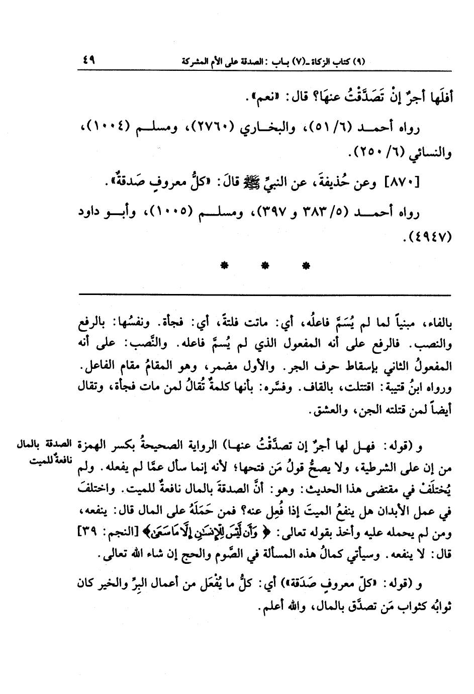 ولم يُختَلف في مقتضى هذا الحديث، وهو: أن الصدقة بالمال نافعة للميت. واختلف في عمل الأبدان هل ينفع الميت إذا فعل عنه؟ فمن حمله على المال قال: ينفعه، ومن لم يحمله عليه وأخذ بقوله تعالى: {وَأَن لَيسَ لِلإِنسَانِ إِلا مَا سَعَى} قال: لا ينفعه. وسيأتي كمال هذه المسألة في الصوم والحج إن شاء الله تعالى.