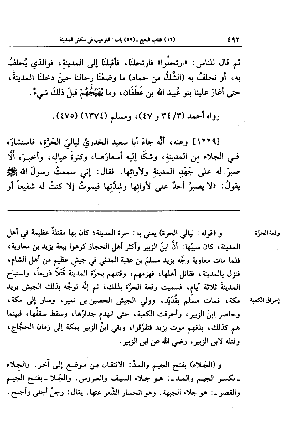 وقوله ليالي الحرة يعني به حرة المدينة، كان بها مقتلة عظيمة في أهل المدينة، كان سببها أن ابن الزبير وأكثر أهل الحجاز كرهوا بيعة يزيد بن معاوية، فلما مات معاوية وجَّه يزيدُ مسلمَ بنَ عقبة المدني في جيشٍ عظيم من أهل الشام فنزل بالمدينة فقاتل أهلها، فهزمهم وقتلهم بحرَّة المدينة قتلًا ذريعًا، واستباح المدينة ثلاثة أيام، فسميت وقعة الحرَّة بذلك، ثم إنه توجه بذلك الجيش يريد مكة، فمات مسلم بقديد، وولي الجيش الحصين بن نمير وسار إلى مكة، وحاصر ابن الزبير، وأحرقت الكعبة حتى انهدم جدارها وسقط سقفها، فبينما هم كذلك بلغهم موت يزيد فتفرقوا، وبقي ابن الزبير بمكة إلى زمان الحجاج وقتله لابن الزبير رضي الله عن ابن الزبير.