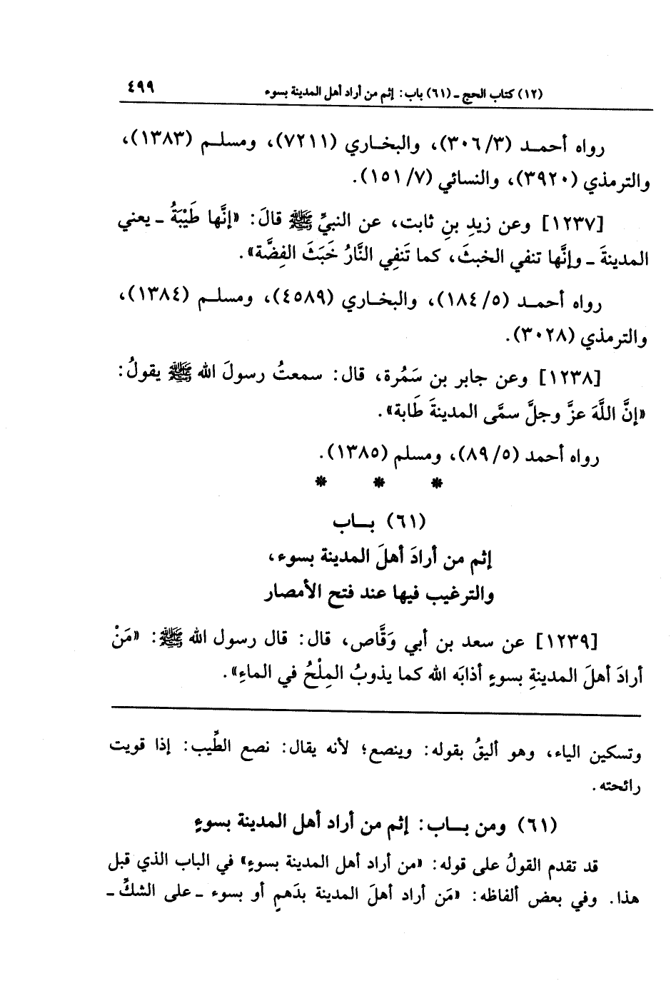 [1239] عن سَعدَ بنَ أَبِي وَقَّاصٍ قال: قَالَ رَسُولُ اللَّهِ صَلَّى اللَّهُ عَلَيهِ وَسَلَّمَ: مَن أَرَادَ أَهلَ المَدِينَةِ بِسُوءٍ أَذَابَهُ اللَّهُ كَمَا يَذُوبُ المِلحُ فِي المَاءِ.