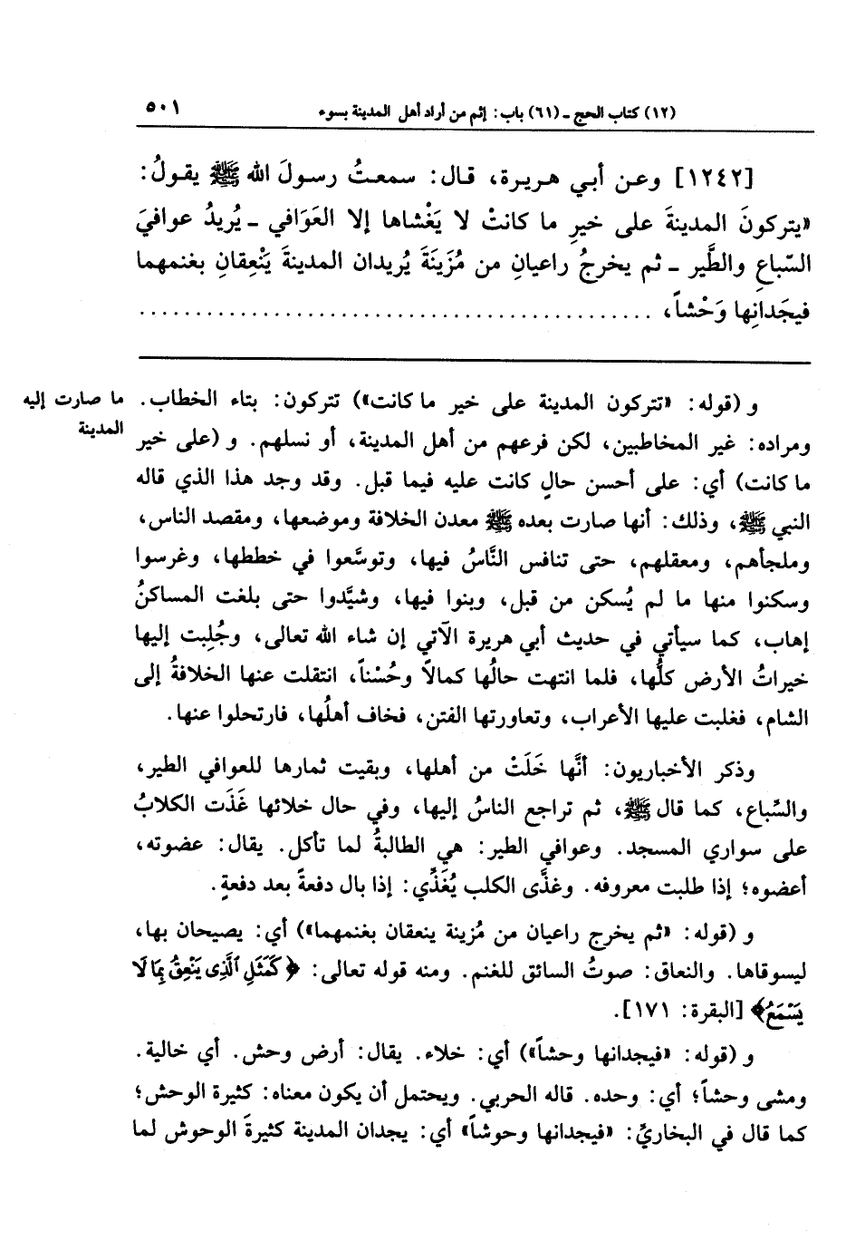 [1242] وعن أبي هُرَيرَةَ قَالَ: سَمِعتُ رَسُولَ اللَّهِ -صَلَّى اللَّهُ عَلَيهِ وَسَلَّمَ- يَقُولُ: يَترُكُونَ المَدِينَةَ عَلَى خَيرِ مَا كَانَت لَا يَغشَاهَا إِلَّا العَوَافِي -يُرِيدُ عَوَافِيَ السِّبَاعِ وَالطَّيرِ- ثُمَّ يَخرُجُ رَاعِيَانِ مِن مُزَينَةَ يُرِيدَانِ المَدِينَةَ يَنعِقَانِ بِغَنَمِهِمَا فَيَجِدَانِهَا وَحشًا،