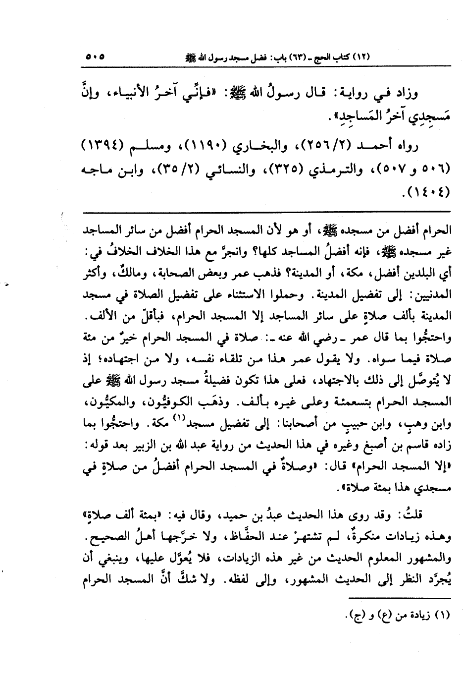 قلت: وقد روى هذا الحديث عبدُ بن حميد وقال فيه بمائة ألف صلاة، وهذه زيادات منكرة لم تشتهر عند الحفاظ ولا خرَّجها أهل الصحيح، والمشهور المعلوم الحديث من غير هذه الزيادات فلا يُعوَّل عليها، وينبغي أن يجرَّد النظر إلى الحديث المشهور وإلى لفظه. ولا شكَّ أن المسجد الحرام