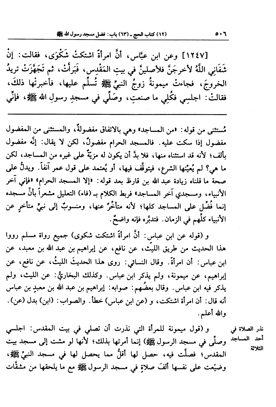 [1247] وعَن ابنِ عَبَّاسٍ أنَّ امرَأَةً اشتَكَت شَكوَى، فَقَالَت: إِن شَفَانِي اللَّهُ لَأَخرُجَنَّ فَلَأُصَلِّيَنَّ فِي بَيتِ المَقدِسِ! فَبَرَأَت، ثُمَّ تَجَهَّزَت تُرِيدُ الخُرُوجَ، فَجَاءَت مَيمُونَةَ زَوجَ النَّبِيِّ -صَلَّى اللَّهُ عَلَيهِ وَسَلَّمَ- تُسَلِّمُ عَلَيهَا فَأَخبَرَتهَا ذَلِكَ، فَقَالَت: اجلِسِي فَكُلِي مَا صَنَعتِ، وَصَلِّي فِي مَسجِدِ رَسُولِ الله صَلَّى اللَّهُ عَلَيهِ وَسَلَّمَ، فَإِنِّي
