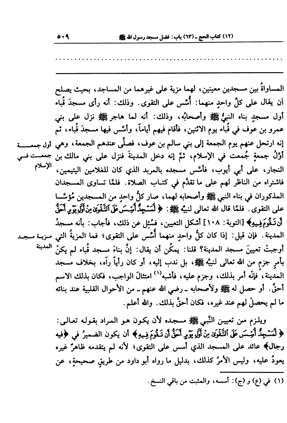 المساواة بين مسجدين معينين لهما مزية على غيرهما من المساجد بحيث يصلح أن يقال على كل واحدٍ منهما أسس على التقوى، وذلك أنه رأى مسجد قباء أول مسجد بناه النبي - صلى الله عليه وسلم - وأصحابه، وذلك أنه لما هاجر - صلى الله عليه وسلم- نزل على بني عمرو بن عوف في قباء يوم الاثنين فأقام فيهم أيامًا وأسس فيها مسجد قباء، ثم إنه ارتحل عنهم يوم الجمعة إلى بني سالم بن عوف فصلَّى عندهم الجمعة، وهي أول جمعة جمعت في الإسلام، ثم إنه دخل المدينة فنزل على بني مالك بن النجار على أبي أيوب فأسس مسجده بالمربد الذي كان للغلامين اليتيمين، فاشتراه من الناظر لهم على ما تقدَّم في كتاب الصلاة، فلما تساوى المسجدان المذكوران في بناء النبي - صلى الله عليه وسلم - وأصحابه لهما صار كل واحدٍ من المسجدين مؤسسًا على التقوى، فلما قال الله تعالى لنبيه صلى الله عليه وسلم: {لَمَسجِدٌ أُسِّسَ عَلَى التَّقوَى مِن أَوَّلِ يَومٍ أَحَقُّ أَن تَقُومَ فِيهِ} أشكل التعيين، فسئل عن ذلك، فأجاب بأنه مسجد المدينة. فإن قيل: إذا كان كل واحد منهما أسس على التقوى، فما المزية التي أوجبت تعيين مسجد المدينة؟ قلنا: يمكن أن يقال إن بناء مسجد قباء لم يكن بأمرٍ جزم من الله تعالى لنبيه صلى الله عليه وسلم، بل ندب إليه، أو كان رأيًا رآه، بخلاف مسجد المدينة فإنه أمر بذلك وجزم عليه، فأشبه (¬1) امتثالَ الواجب، فكان بذلك الاسم أحق. أو حصل له - صلى الله عليه وسلم - ولأصحابه رضي الله عنهم من الأحوال القلبية عند بنائه ما لم يحصل لهم عند غيره فكان أحق بذلك، والله أعلم.
