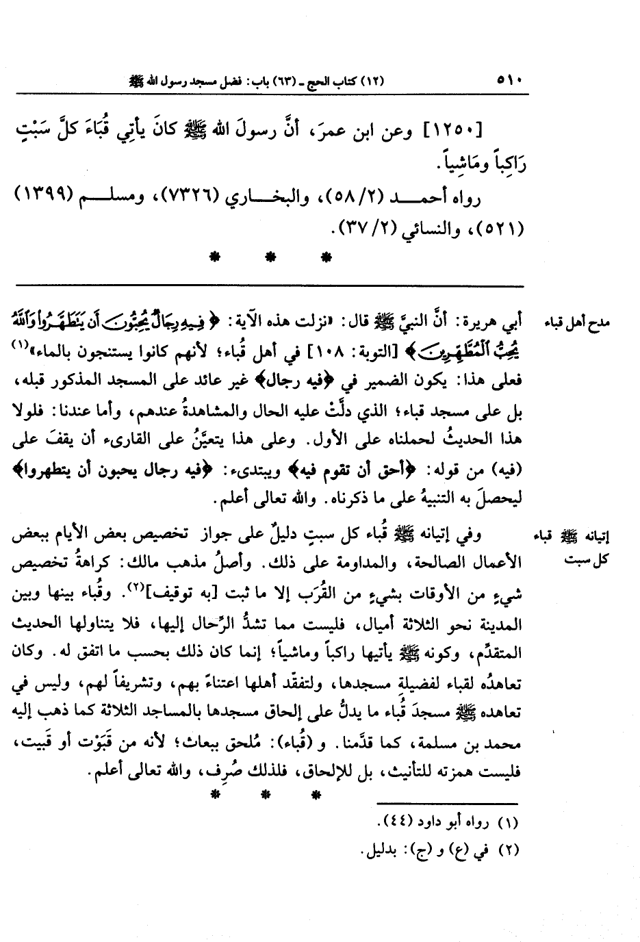 [1250] وعَن ابنِ عُمَرَ أَنَّ رَسُولَ اللَّهِ -صَلَّى اللَّهُ عَلَيهِ وَسَلَّمَ- كَانَ يأتي قُبَاءً كل سبت رَاكِبًا وَمَاشِيًا.