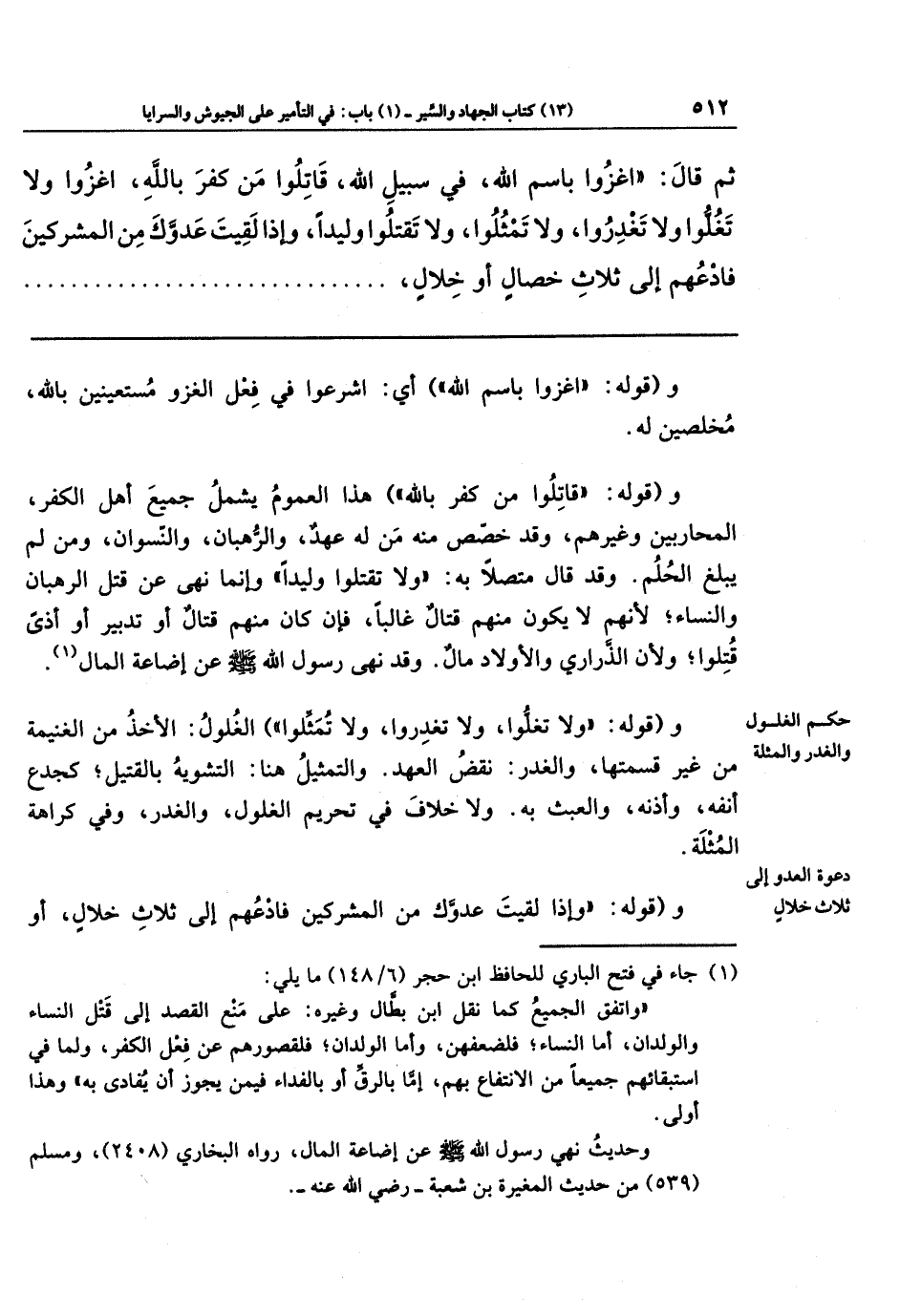 ثُمَّ قَالَ: اغزُوا بِاسمِ اللَّهِ، فِي سَبِيلِ اللَّهِ، قَاتِلُوا مَن كَفَرَ بِاللَّهِ، اغزُوا وَلَا تَغُلُّوا، وَلَا تَغدِرُوا، وَلَا تَمثُلُوا، وَلَا تَقتُلُوا وَلِيدًا، وَإِذَا لَقِيتَ عَدُوَّكَ مِن المُشرِكِينَ فَادعُهُم إِلَى ثَلَاثِ خِصَالٍ (أَو خِلَالٍ)،