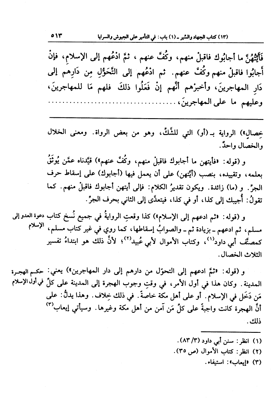 وقوله: (ثم ادعهم إلى الإسلام)؛ كذا وقعت الرواية في جميع نسخ كتاب مسلم: (ثم ادعهم) بزيادة (ثم)، والصواب إسقاطها، كما روي في غير كتاب مسلم؛ كمصنف أبي داود (¬1)، وكتاب الأموال لأبي عبيد (¬2)؛ لأن ذلك هو ابتداء تفسير الثلاث الخصال.
