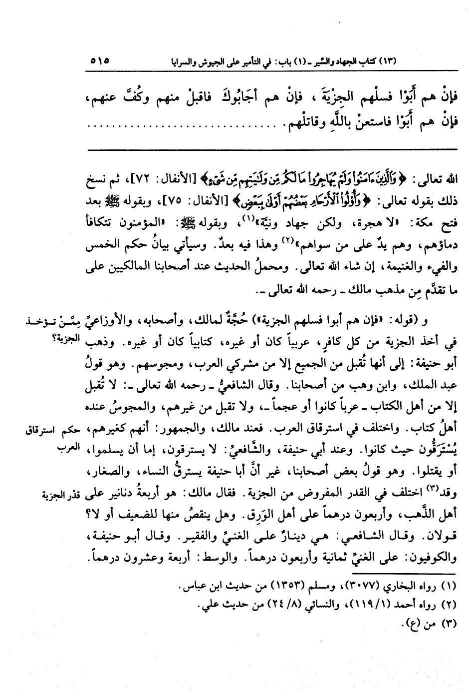 الله تعالى: {وَالَّذِينَ آمَنُوا وَلَم يُهَاجِرُوا مَا لَكُم مِن وَلايَتِهِم مِن شَيءٍ} ثم نسخ ذلك بقوله تعالى: {وَأُولُو الأَرحَامِ بَعضُهُم أَولَى بِبَعضٍ} وبقوله - صلى الله عليه وسلم - بعد فتح مكة: (لا هجرة ولكن جهاد ونية) (¬1)، وبقوله - صلى الله عليه وسلم -: (المؤمنون تتكافأ دماؤهم وهم يد على من سواهم) (¬2)، وهذا فيه بُعد. وسيأتي بيان حكم الخمس والفيء والغنيمة، إن شاء الله تعالى. ومحمل الحديث عند أصحابنا المالكيين على ما تقدَّم من مذهب مالك رحمه الله تعالى.